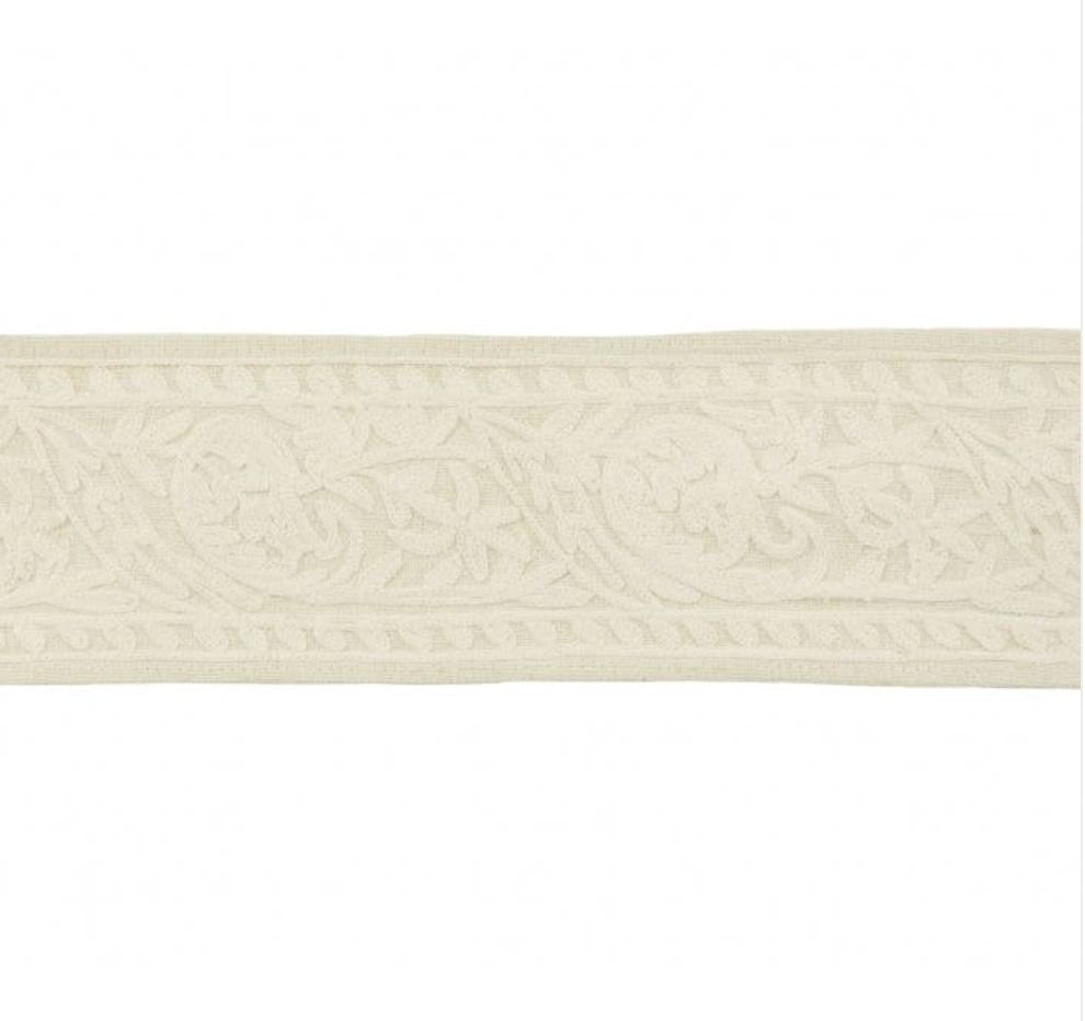 Satin stitched on a linen tape, this twist design has a retro flair. Width- 3.75"...