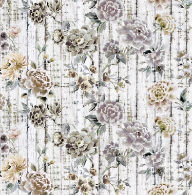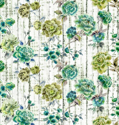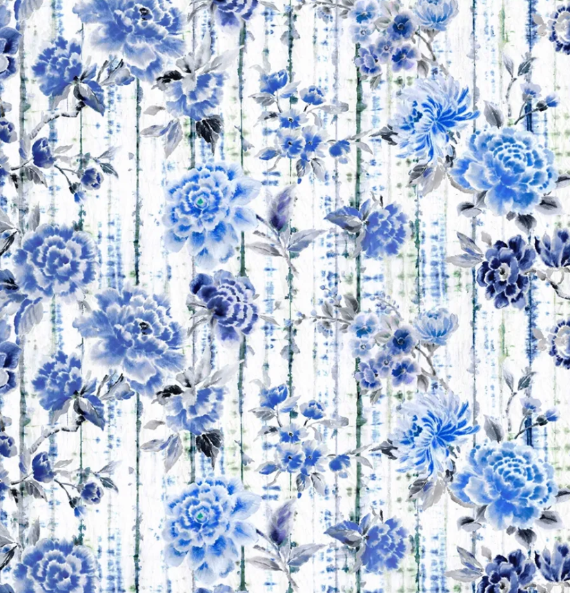 This sophisticated print features inky renderings of peonies and roses on a soft water-colored striped ground inspired by spring time blossom season in Kyoto.