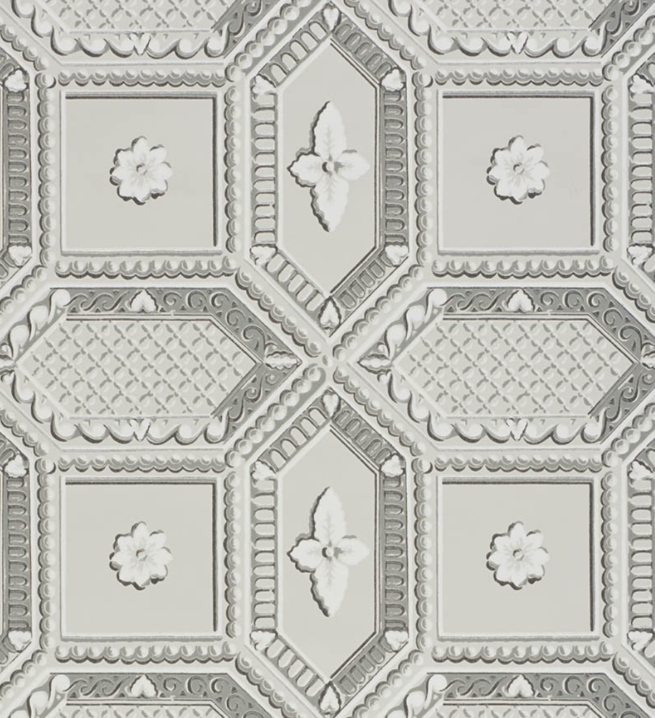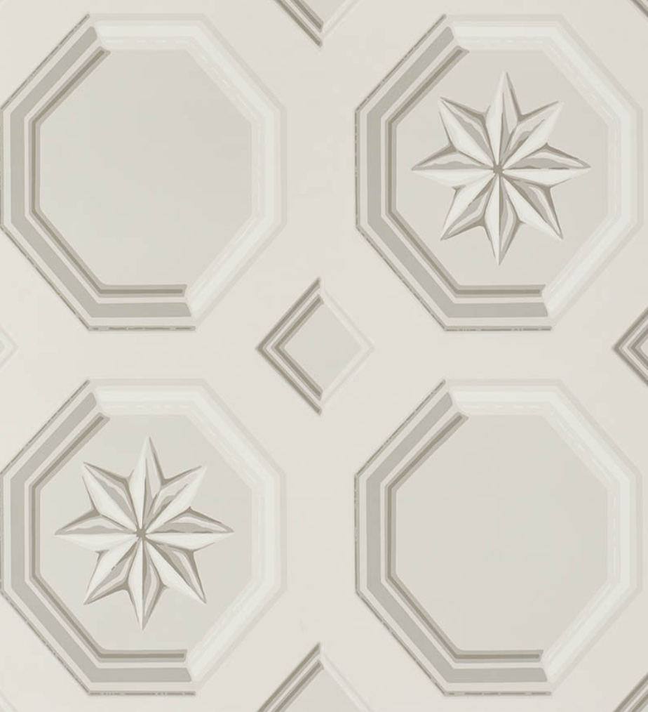 This handsome wallpaper features an octagonal grid punctuated by faceted stars and floral medallions, evoking...