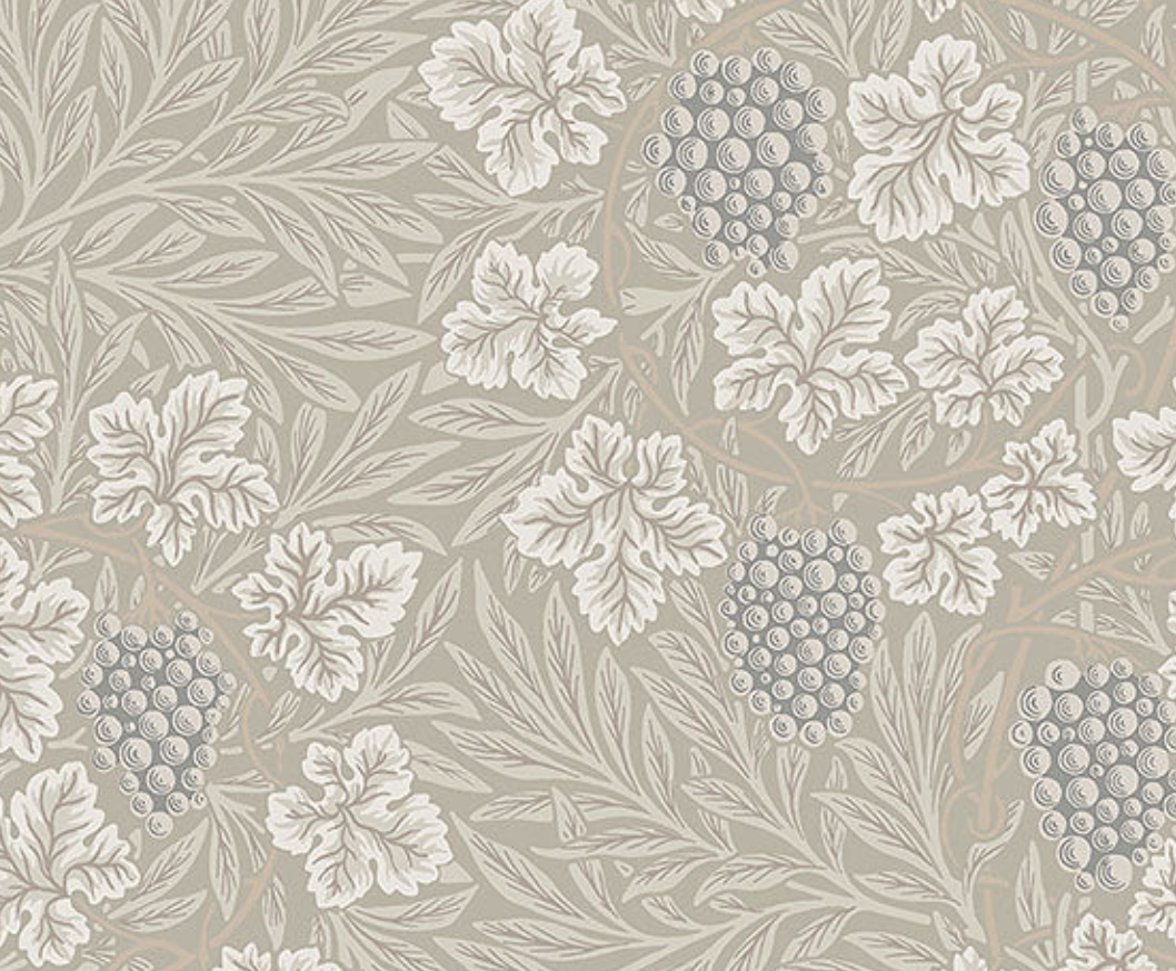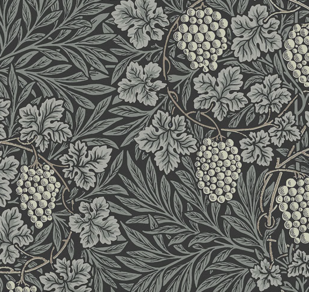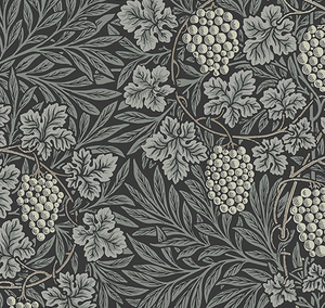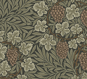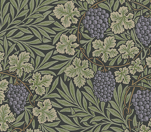 Rich in detail and contrast, Vine is a faithful interpretation of a classic William Morris pattern from 1873. Featuring lush bunches of plump grapes set against hypnotically circulating vine stems as well as willow and vine leaves,