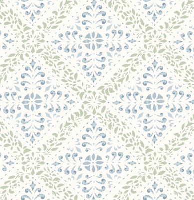 Nyborg in blue-and-green is a charming trellis-motif wallpaper with simplistic flourishes and pleasing leaf shapes reminiscent of an antique stencil. From Swedish heritage brand Boråstapeter.