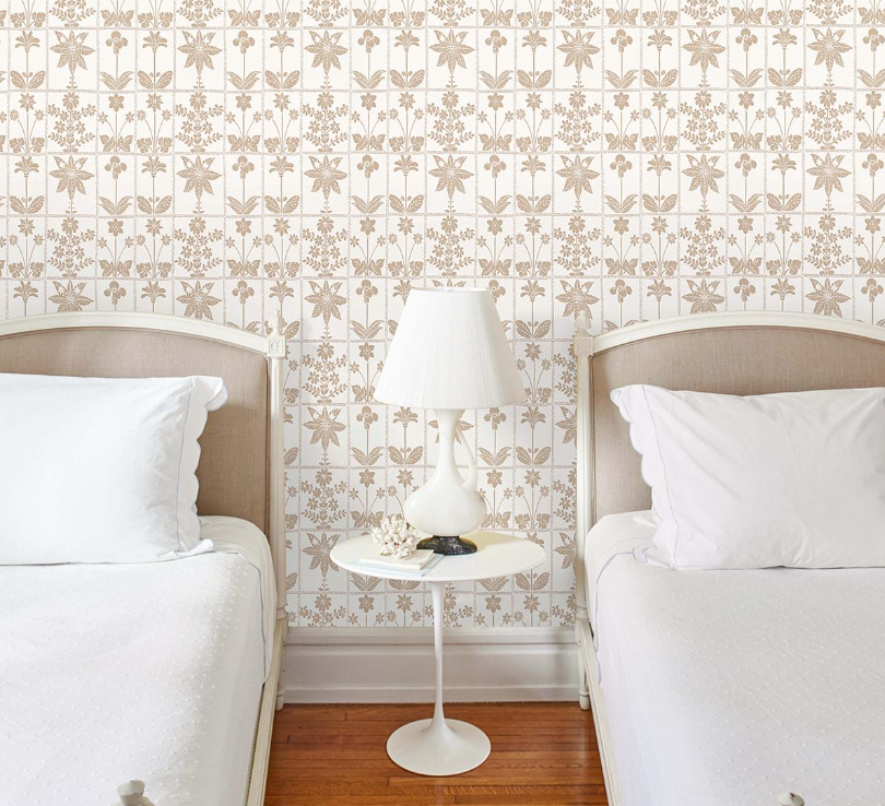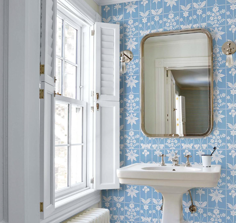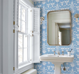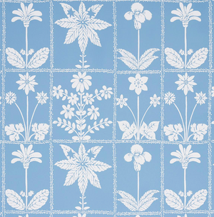 Inspired by a midcentury pattern in our archive, Georgia Wildflowers in blue is a stylized silhouette design with endless charm. This appealing mid-scale botanical wallpaper, with its delicate grid of flowers, has a wonderful graphic simplicity and an artisanal hand-printed look.