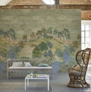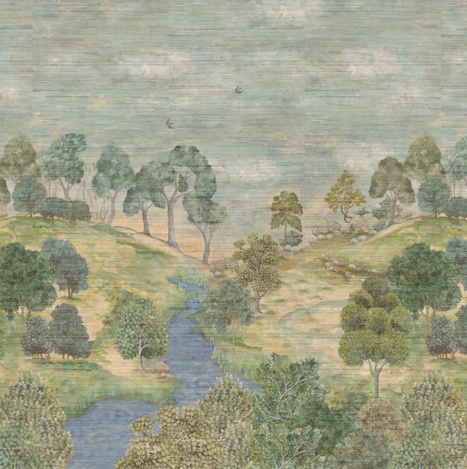 Inspired by the Indian miniature paintings of serene and peaceful landscapes this pastoral mural of a green valley and stream incorporates delicately painted trees and pastures with a softly clouded sky and flying birds.