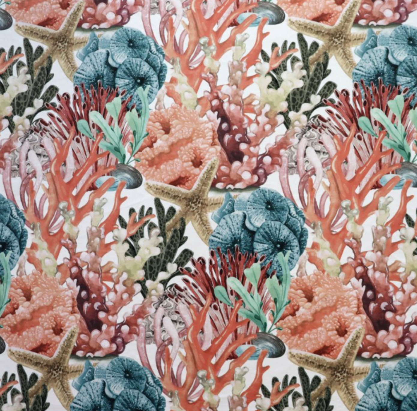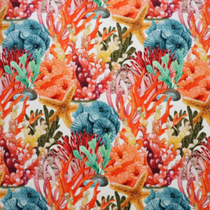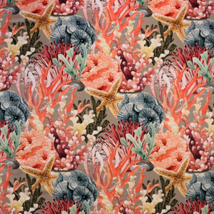 Amazing color combo's of various corals in a reef printed on a luxury velvet.