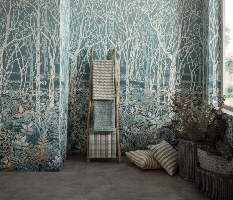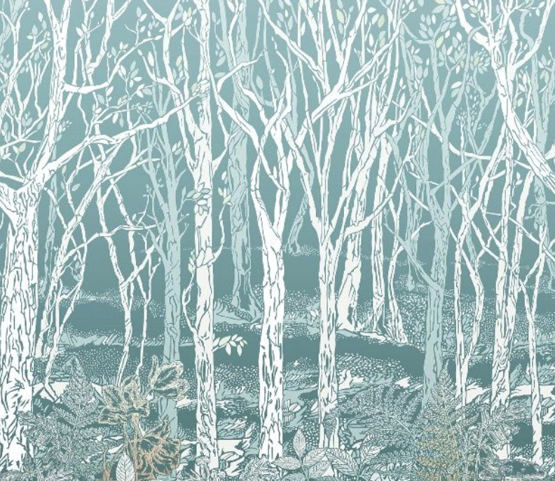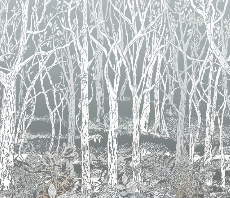 A whimsical woodland scene with a carpet of ferns, bluebells, wild tulips and toadstools is presented as a woodcut mural design with ombre color throughout the trees, foliage and background. This wallcovering has been designed as three panels.
