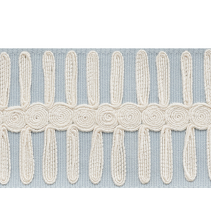 Heavily embroidered on a handsome, ribbed cotton ground, this tape has a graphic and dramatic...