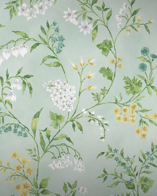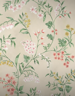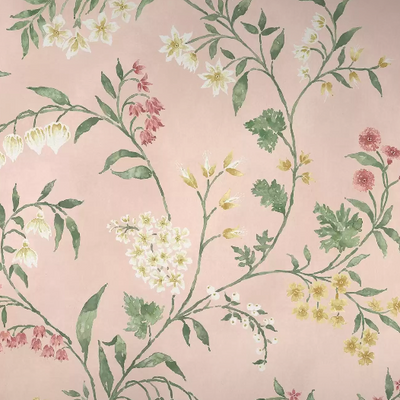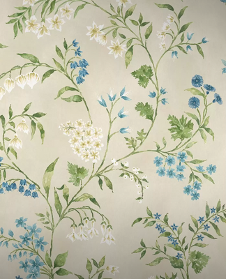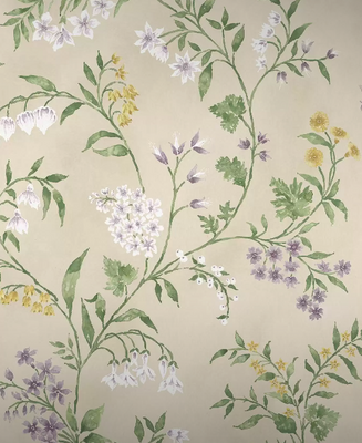 This delicate floral design featuring bell flowers and fuchsias in a trailing repeat.