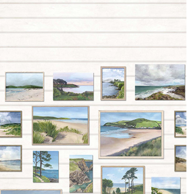 Watercolor seascape paintings are displayed on a faux painted wood paneled wall.