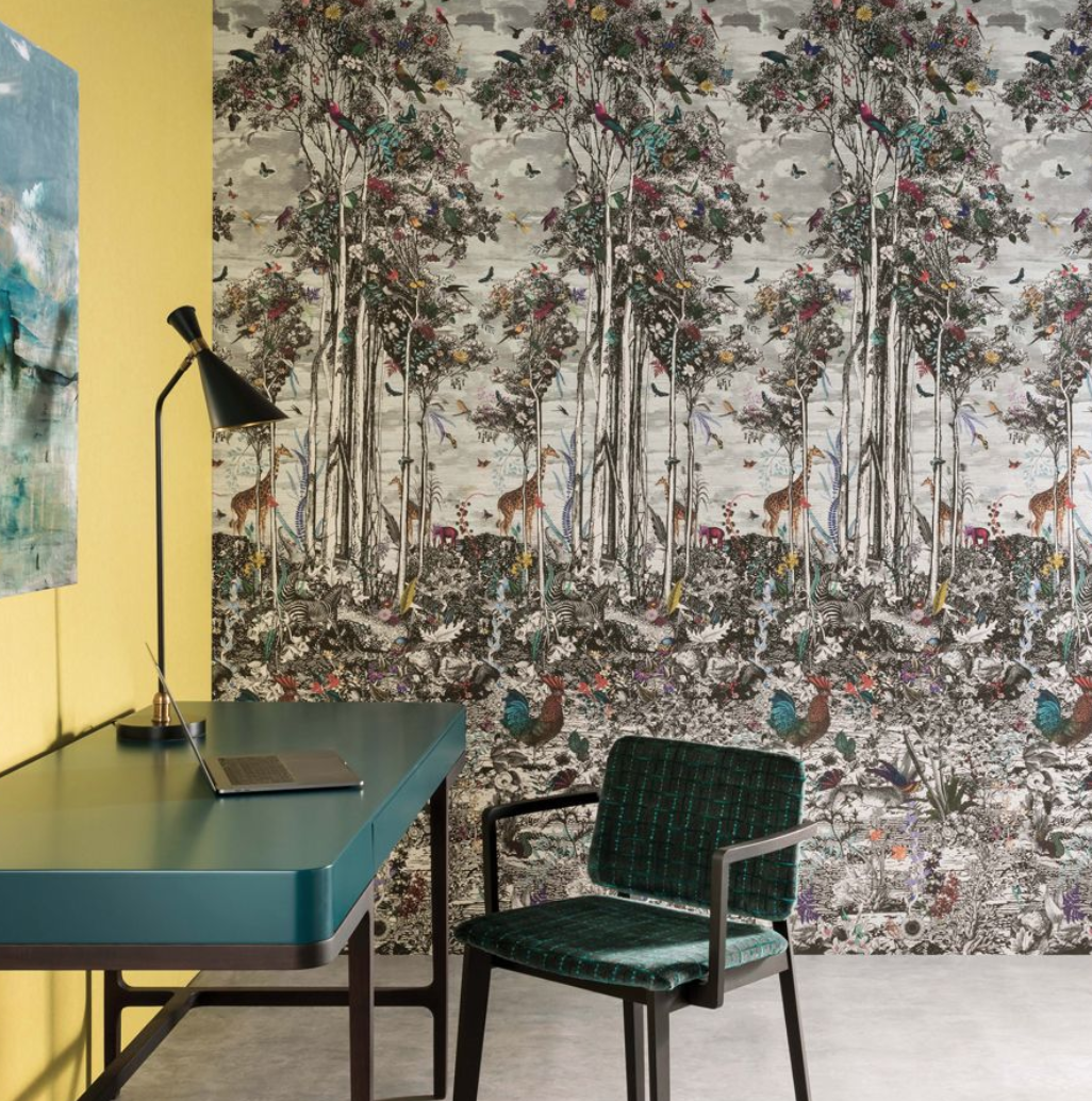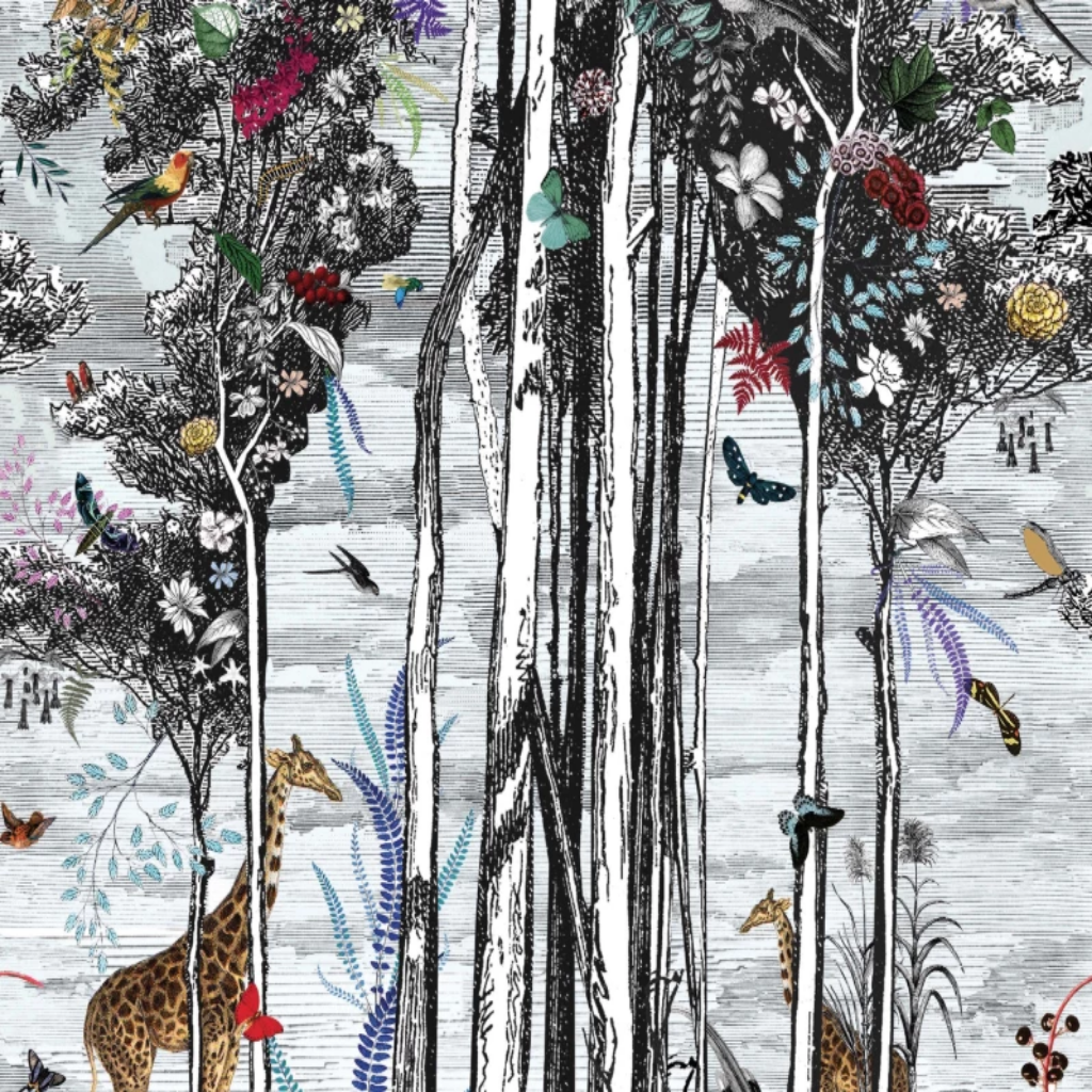 A fantastical array of colorful birds and exotic animals set against the background of tall trees and cloudy skies depicted in monochrome.