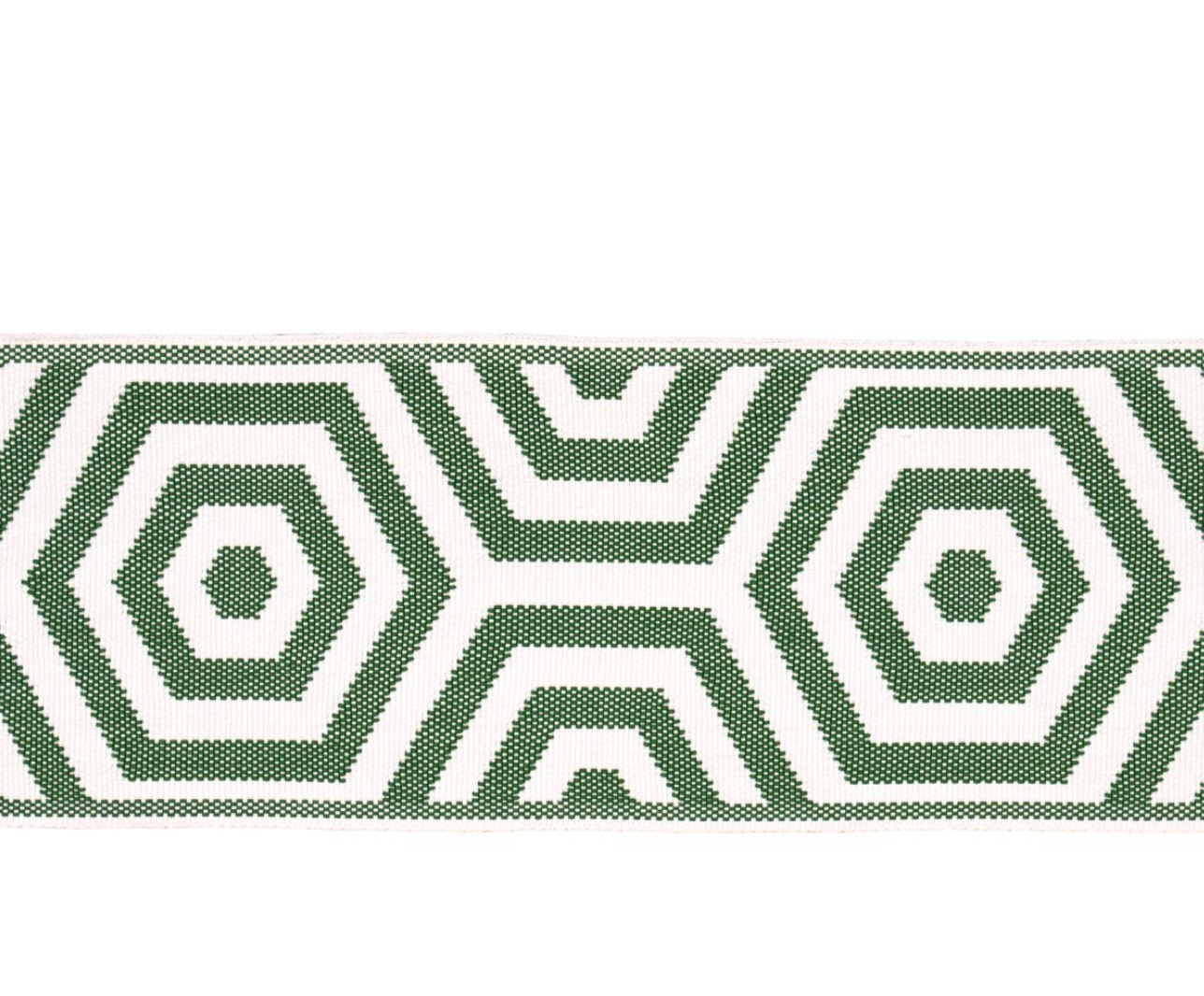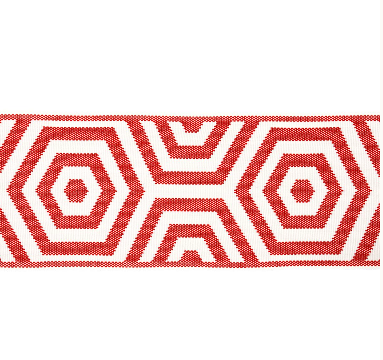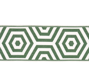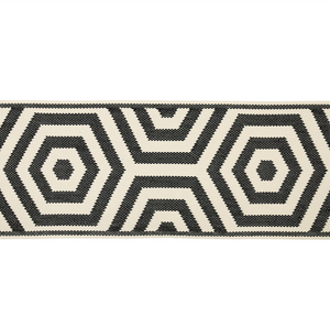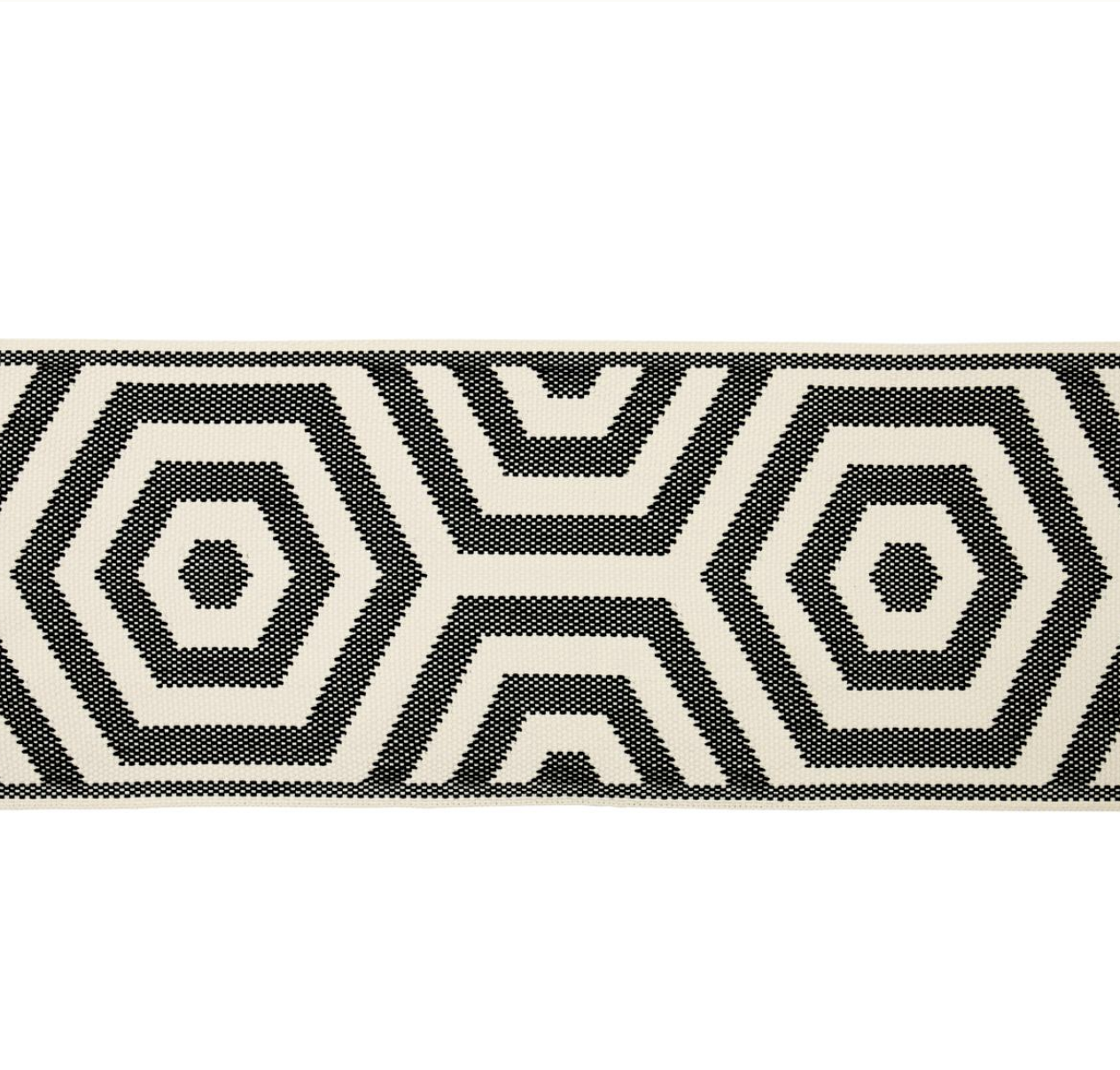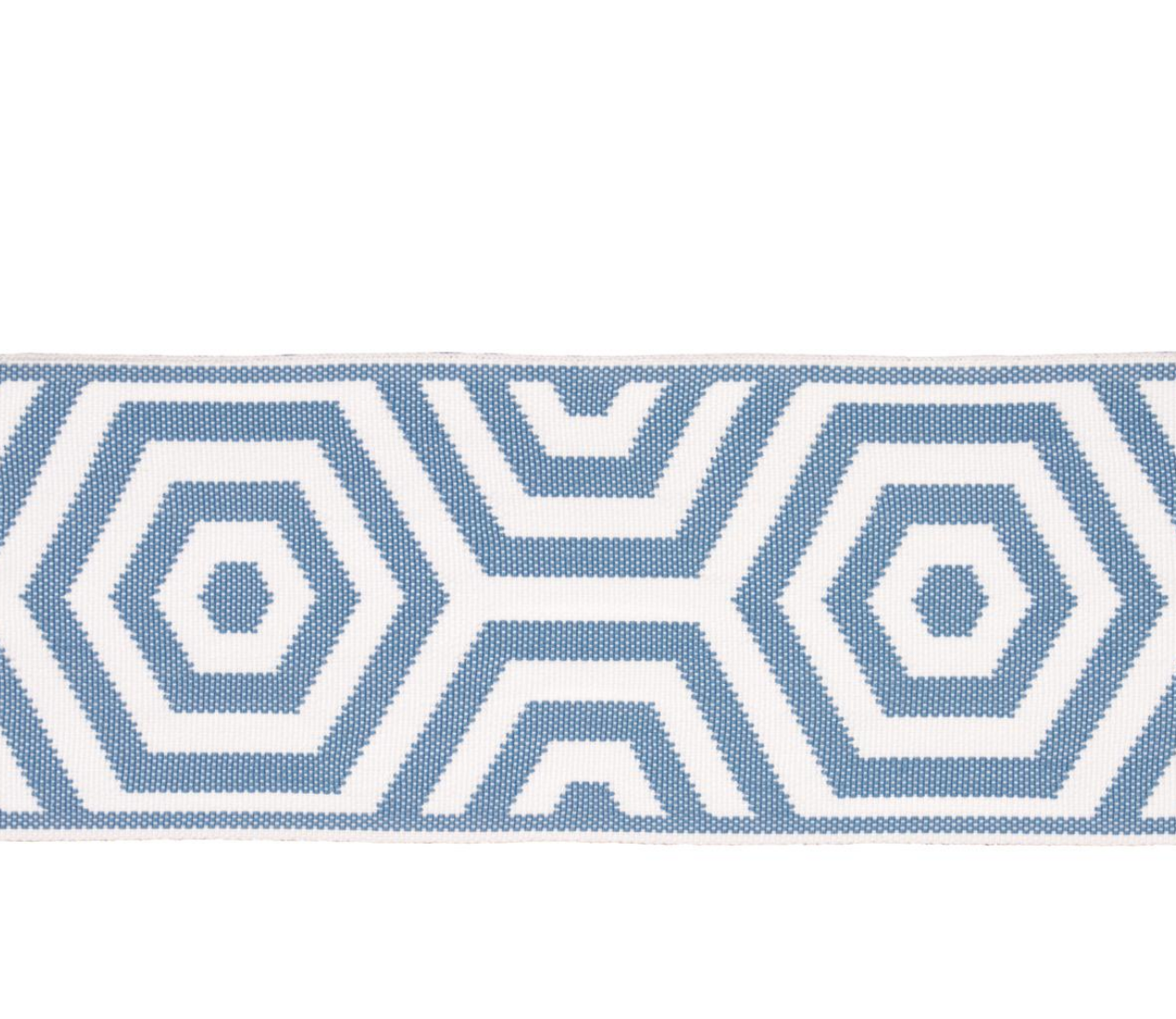 Hardworking and high style, Bees Knees Indoor/Outdoor Tape in sky is a mod geometric trim designed by Mary McDonald. The tight high-performance weave resists stains, moisture, mildew and fading.