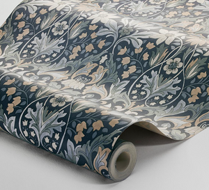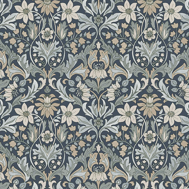 Blomsterfröjd in indigo owes its rich intertwining floral design to the stylized organic patterns associated with the Arts and Crafts Movement.