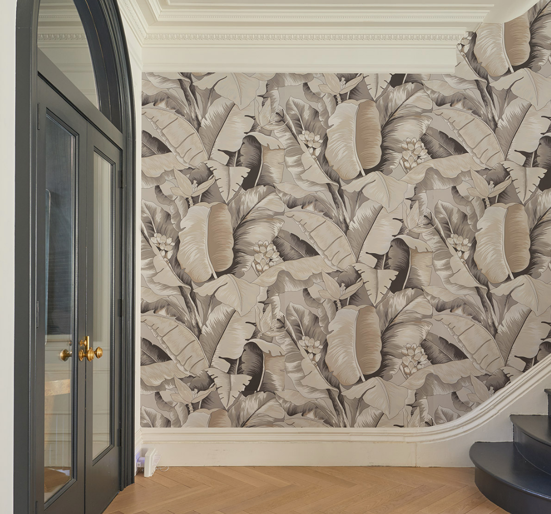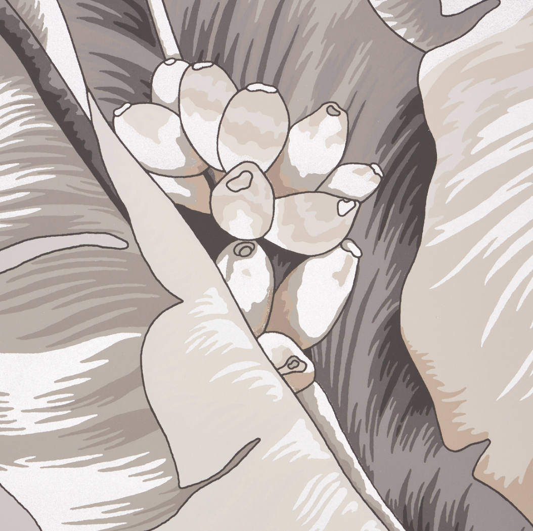 A tropical design with a glamorous touch, this woven pattern in platinum features dense layers of lush palm fronds. It's a familiar motif made chic with subtle shimmer, intricate details and a life-size scale.