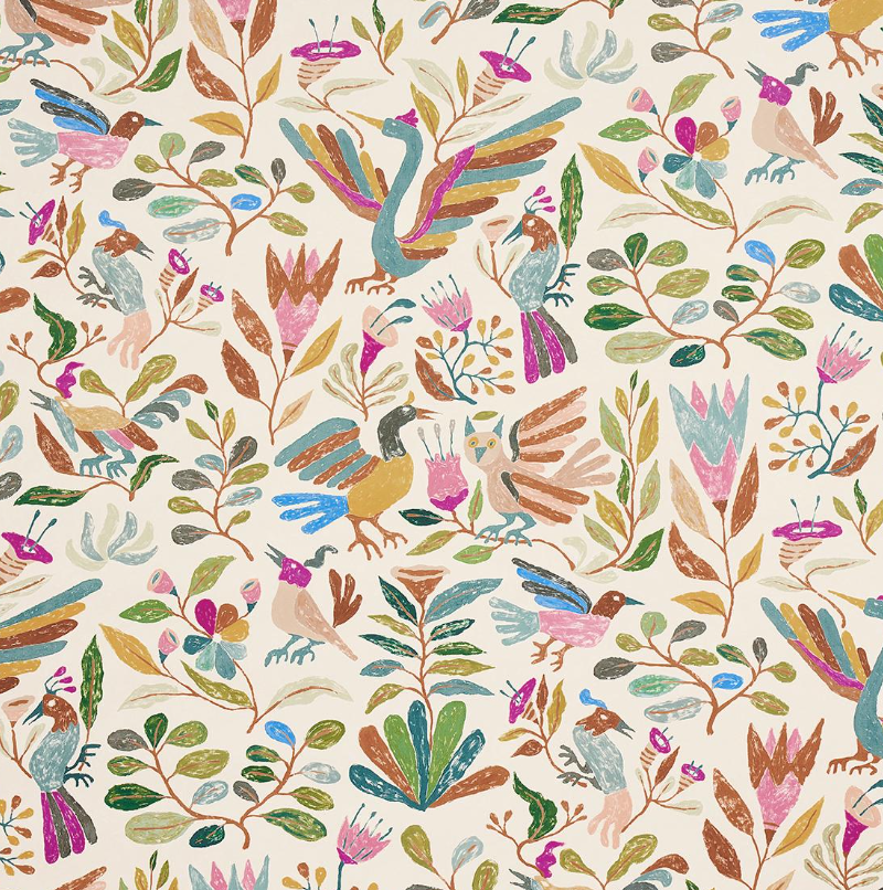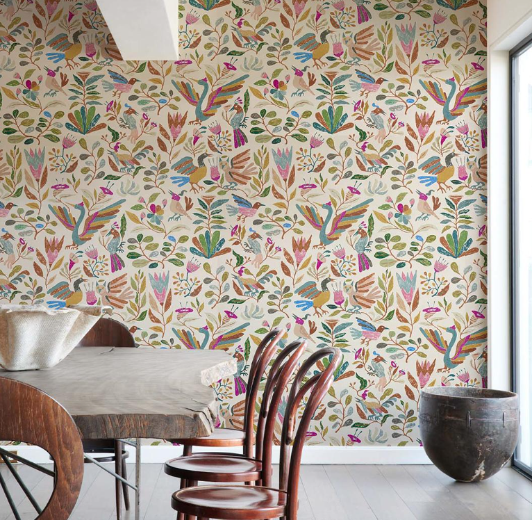 This wide width wallpaper is a fun rendition of a Mexican embroidery design.