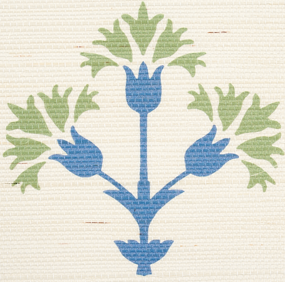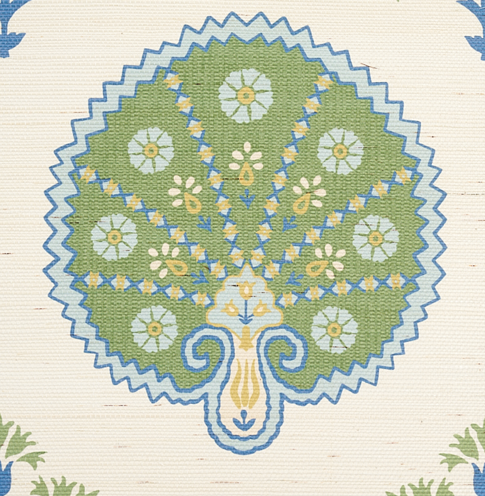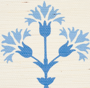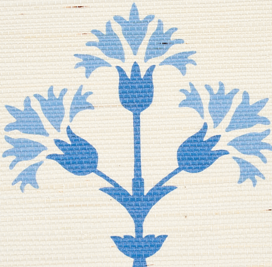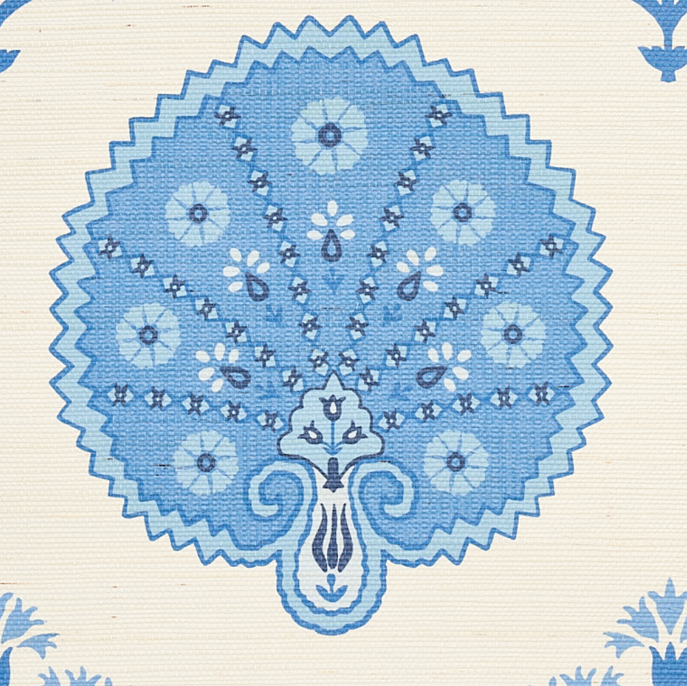 This intricate blue wallpaper design features traditional Ottoman fans and flowers with delicate flourishes. Printed on a sisal ground, the design has an incredible combination of texture and fine detail.