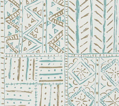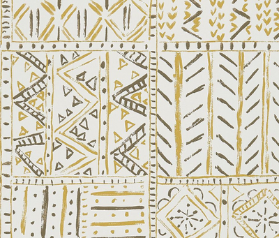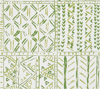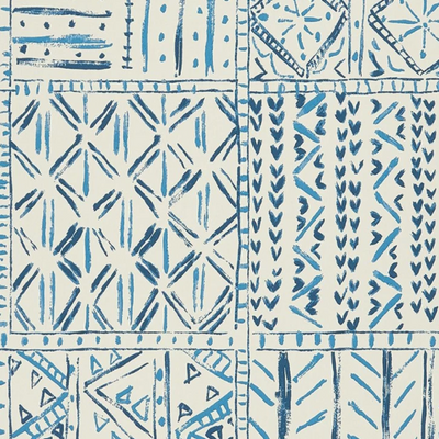 Painterly brushstrokes form informal geometric patterns within squares. The design is printed on a textured fibrous ground.