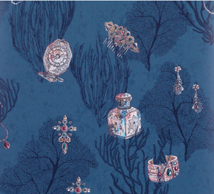 An undersea scene which imagines the jewelry and treasures from a Spanish galleon caught on stems of coral.