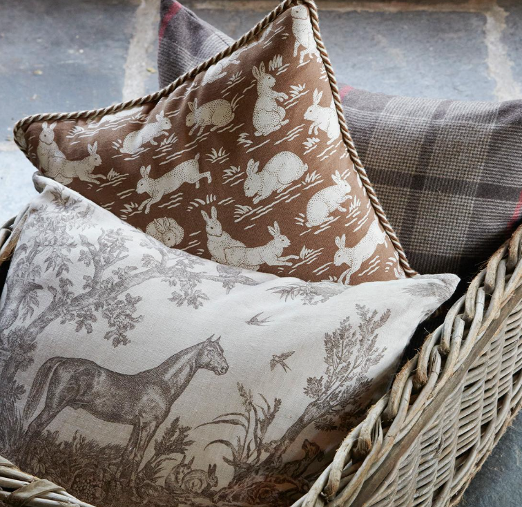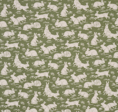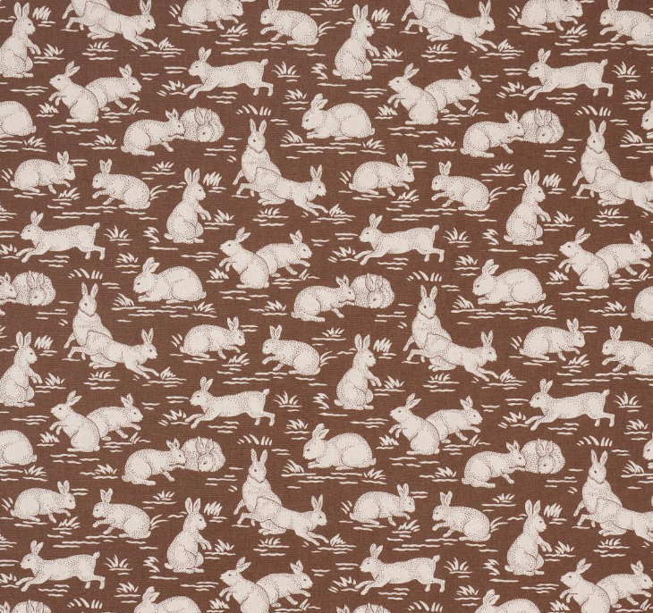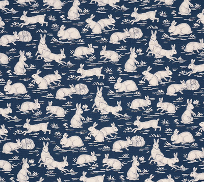 Inspired by the stylized simplicity of Japanese woodblock prints, Cottontails is a charming small-scale pattern enlivened by silhouettes of woodland rabbits.