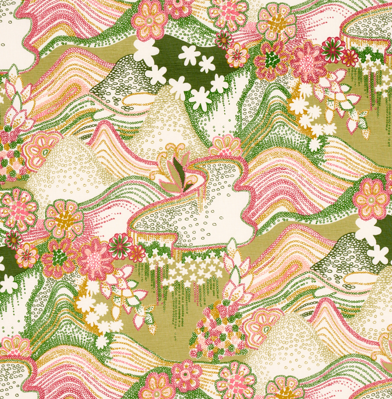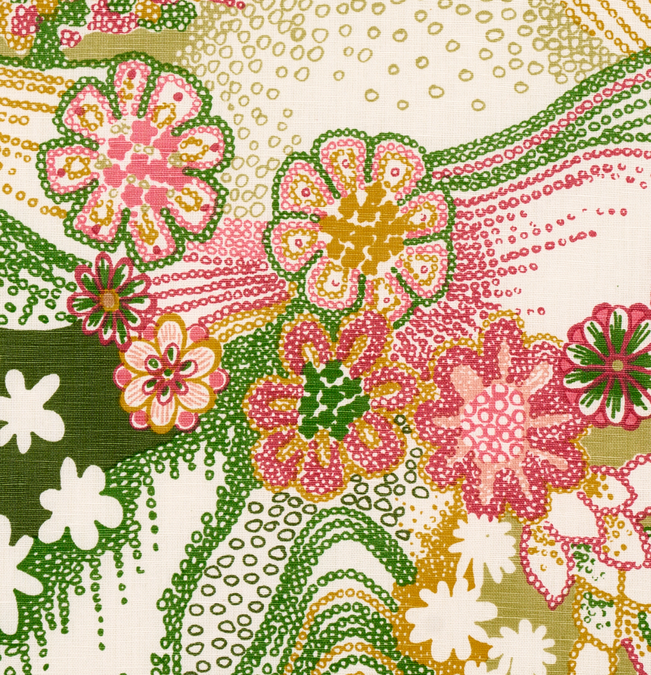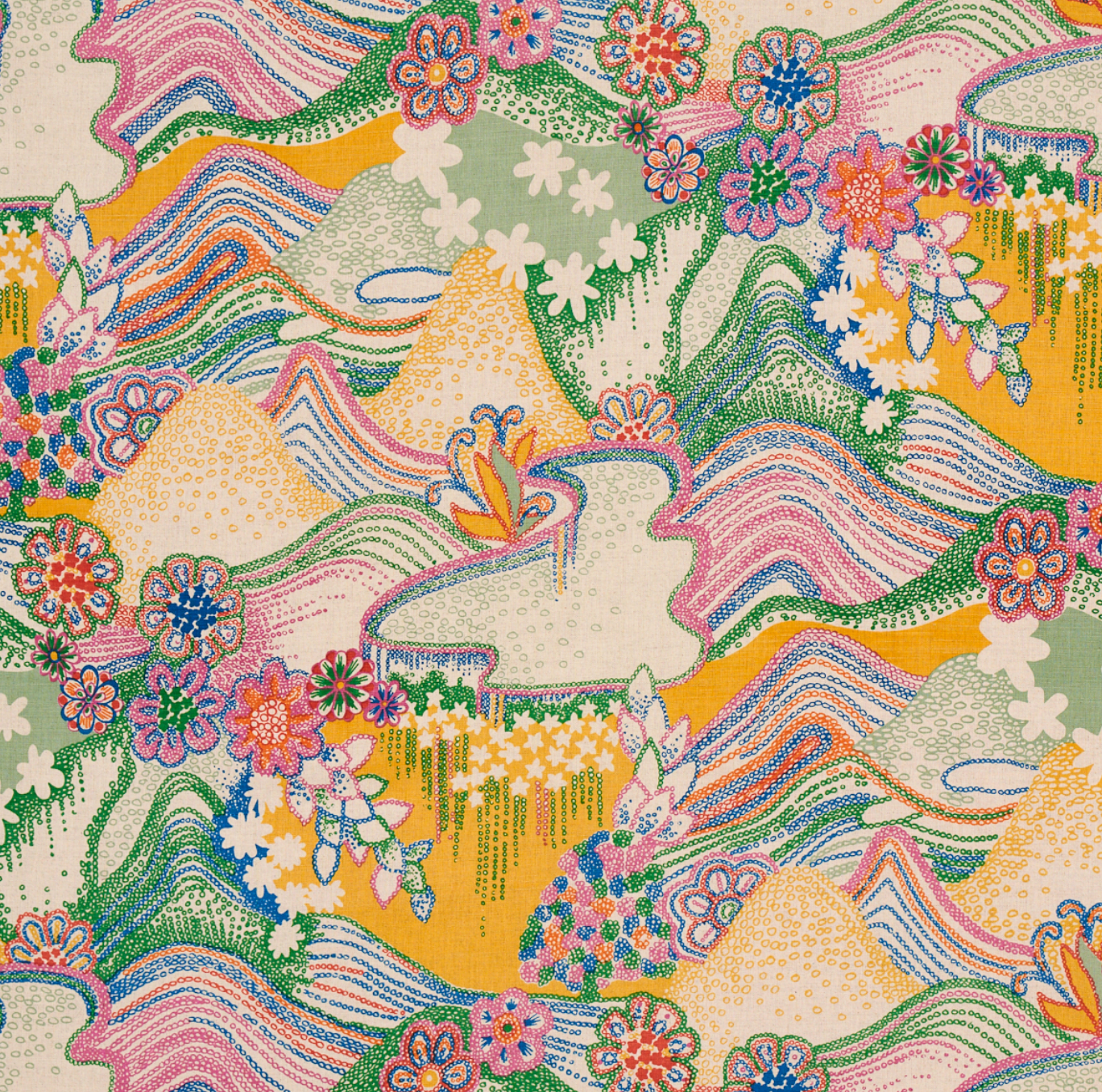 Daisy Chain is a light multi  homage to a vintage 1970s print that instantly transported them to their childhood bedrooms. Vaguely psychedelic, the medium-scale fabric is a trippy landscape of rolling hills and seas made of beads and daisy chains. Also available as a wallpaper.