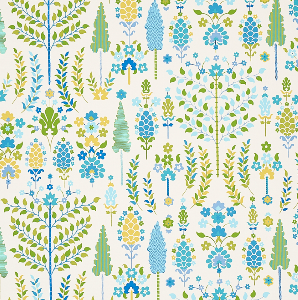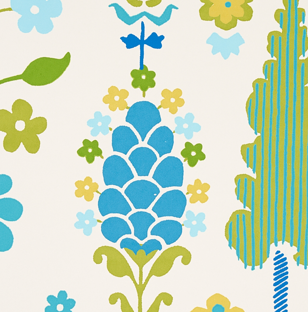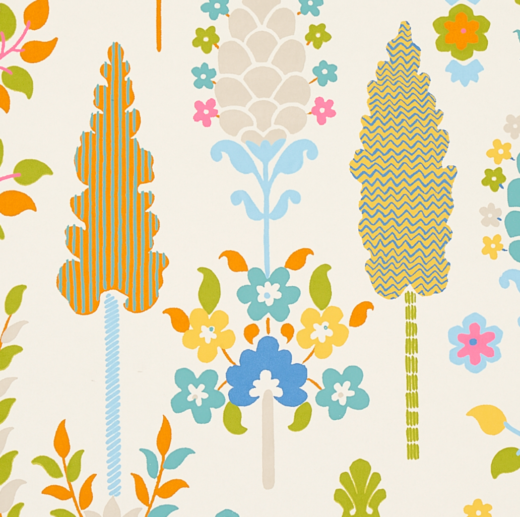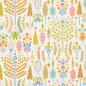 A whimsical forest of trees takes root in this charming screen-printed wall-covering with a folk art feel.