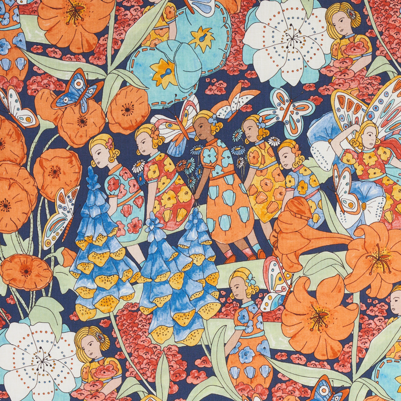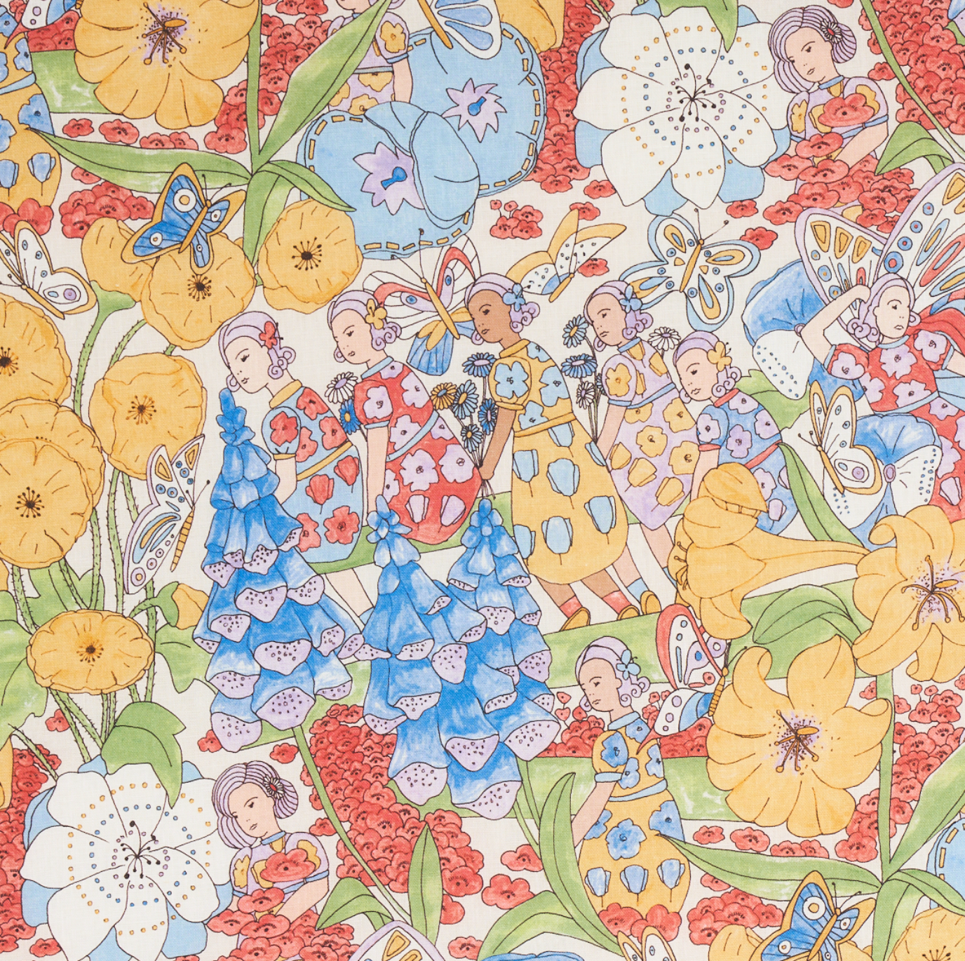 Fairie Garden in yellow-and-ivory is at first glance an exuberant and romantic floral, but it reveals a hidden universe of doll-like girls and fairies with butterfly wings.