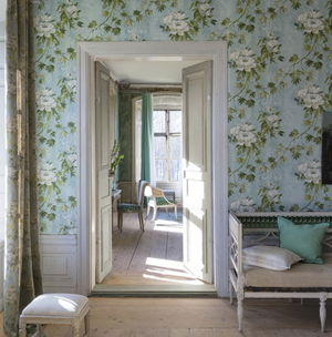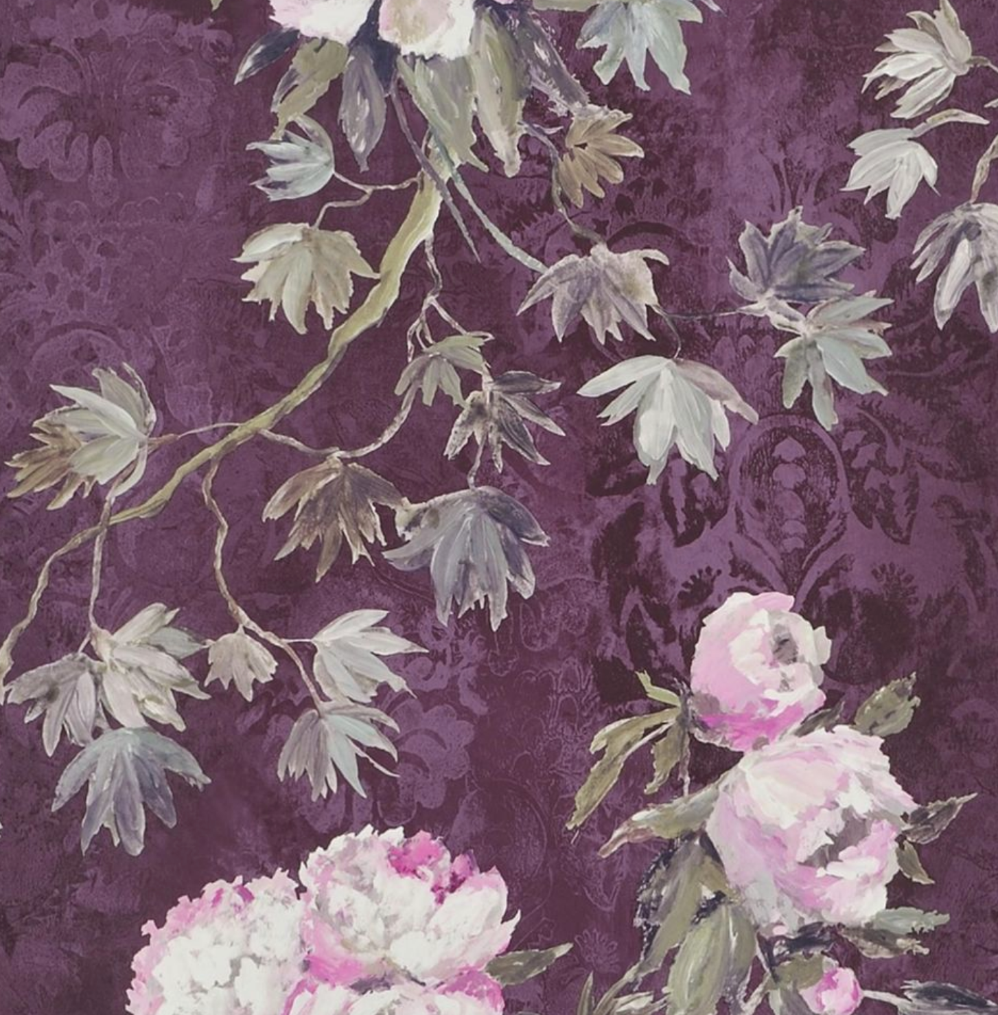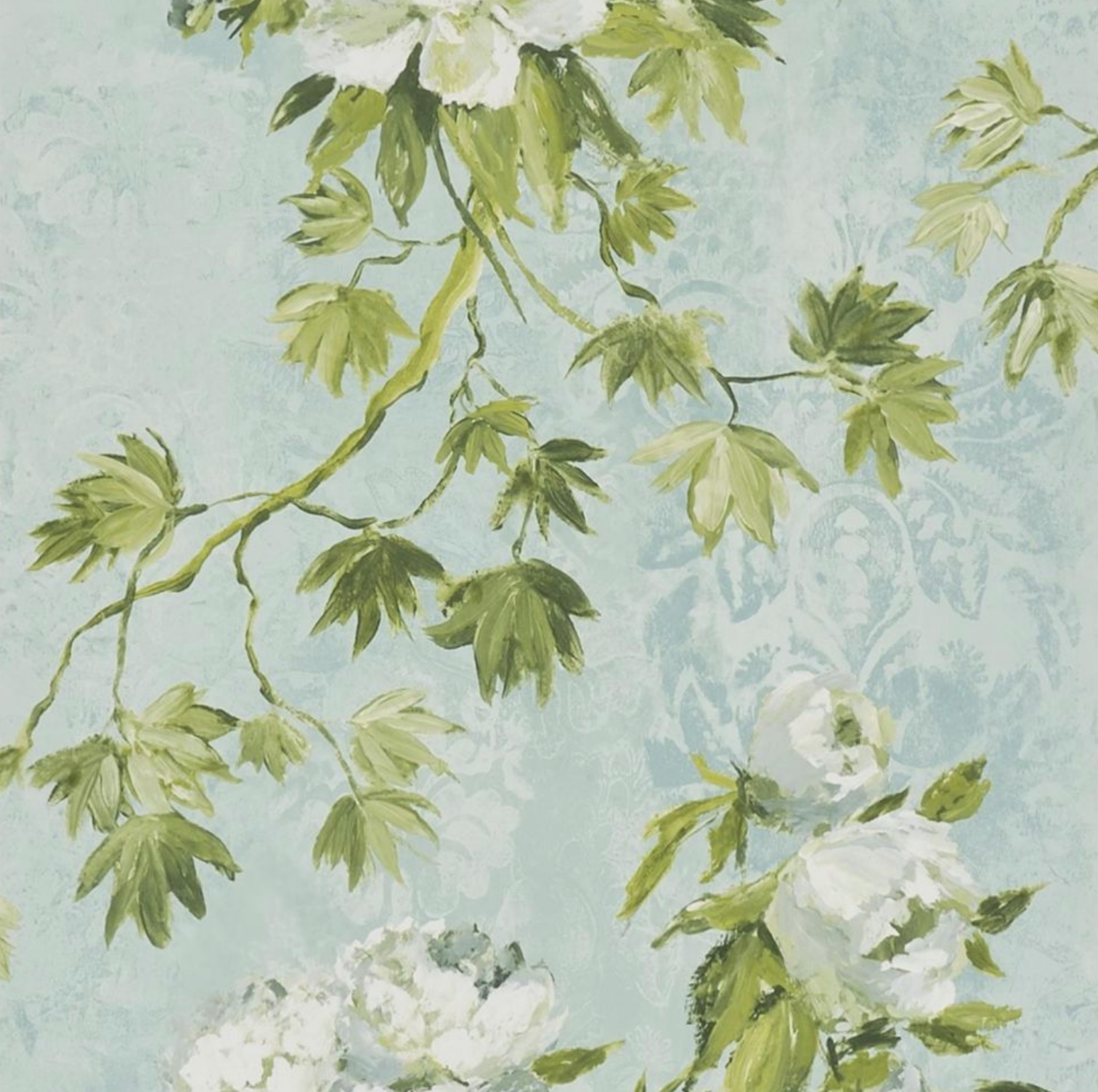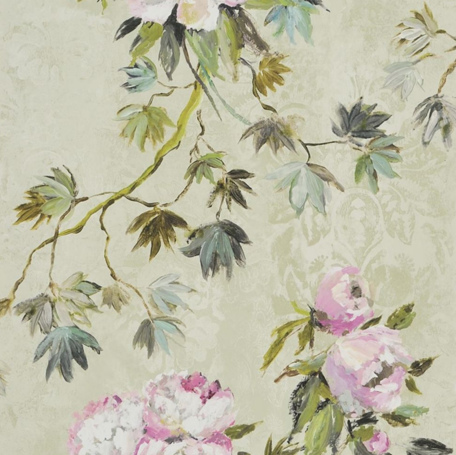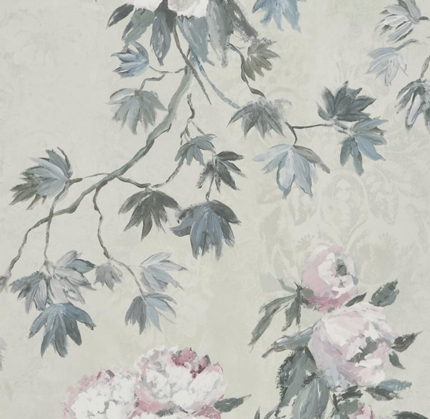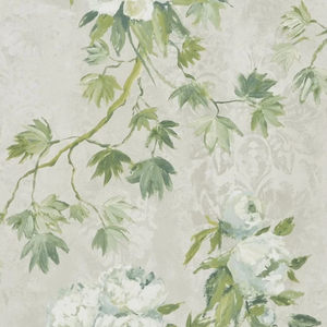 Painterly white peonies and foliage coordinate beautifully with subtle fresco backgrounds. Distressed damasks introduce elegant, restrained structure. Printed on easy to hang, washable, non-woven grounds.