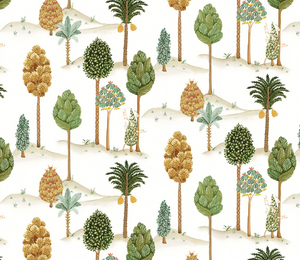 A charming depiction of stylized Indian trees. The colorways encompass various shades of green with golden accents, capturing a natural ambience.