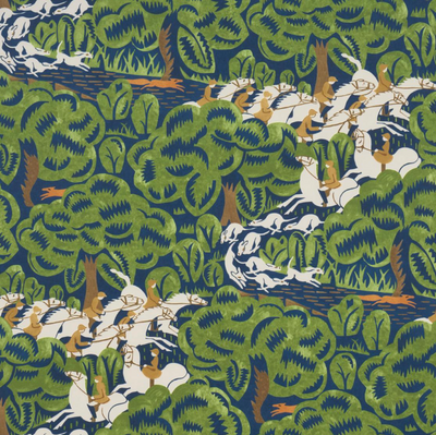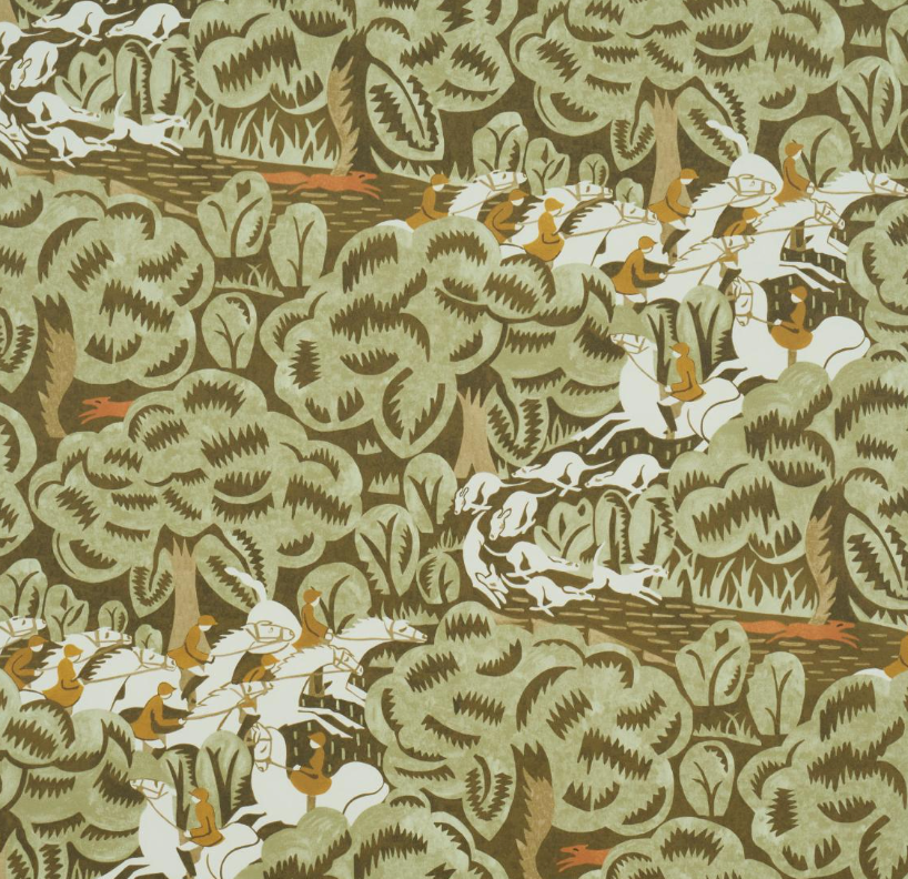 Lively and graphic medium scale fox hunt pattern with an Art Deco aesthetic.
