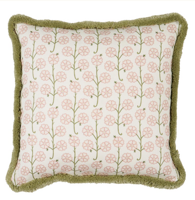 This amazing design was Inspired by the 16th century illustrations of the flora and fauna , this is a small scale linen rose tone floral. A gorgeous brush fringe adorns the edges. Down insert is included.