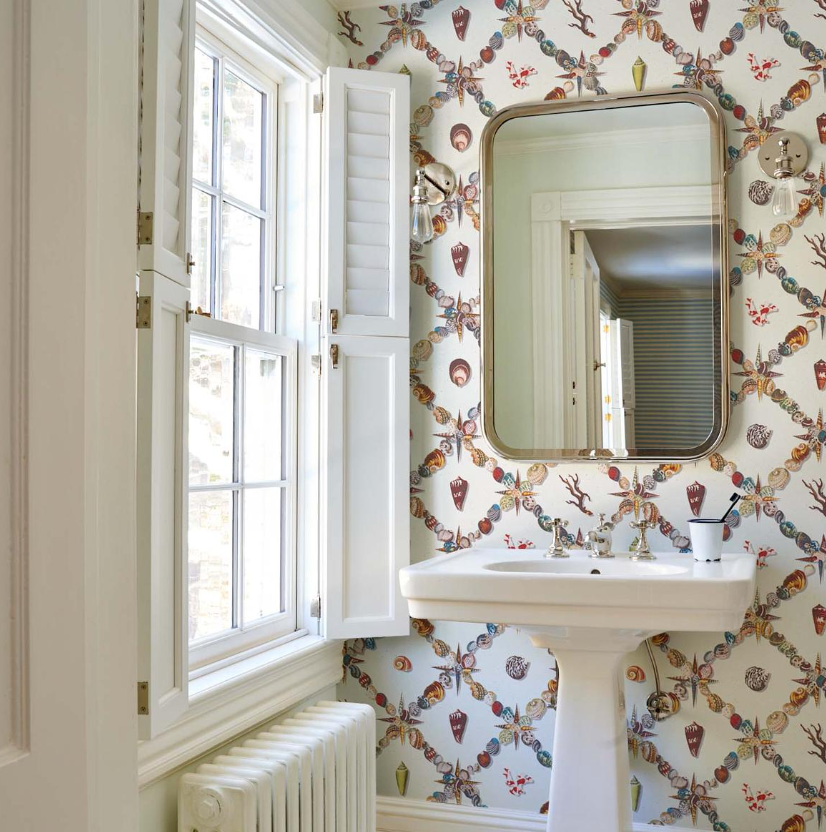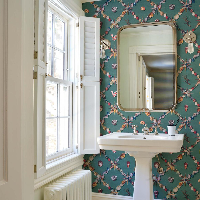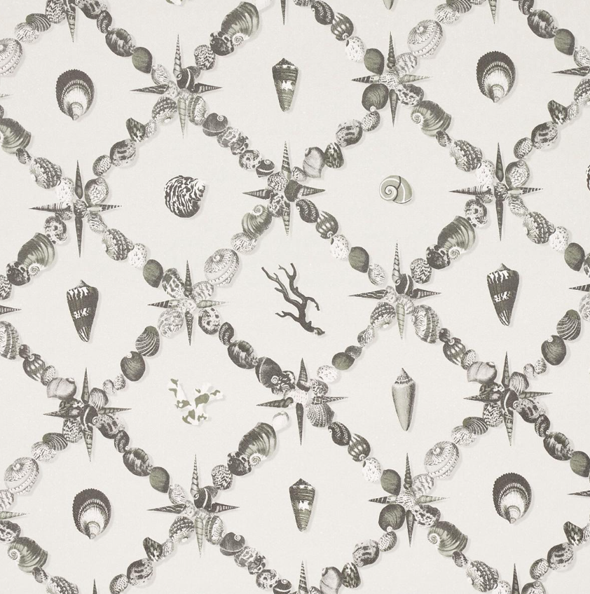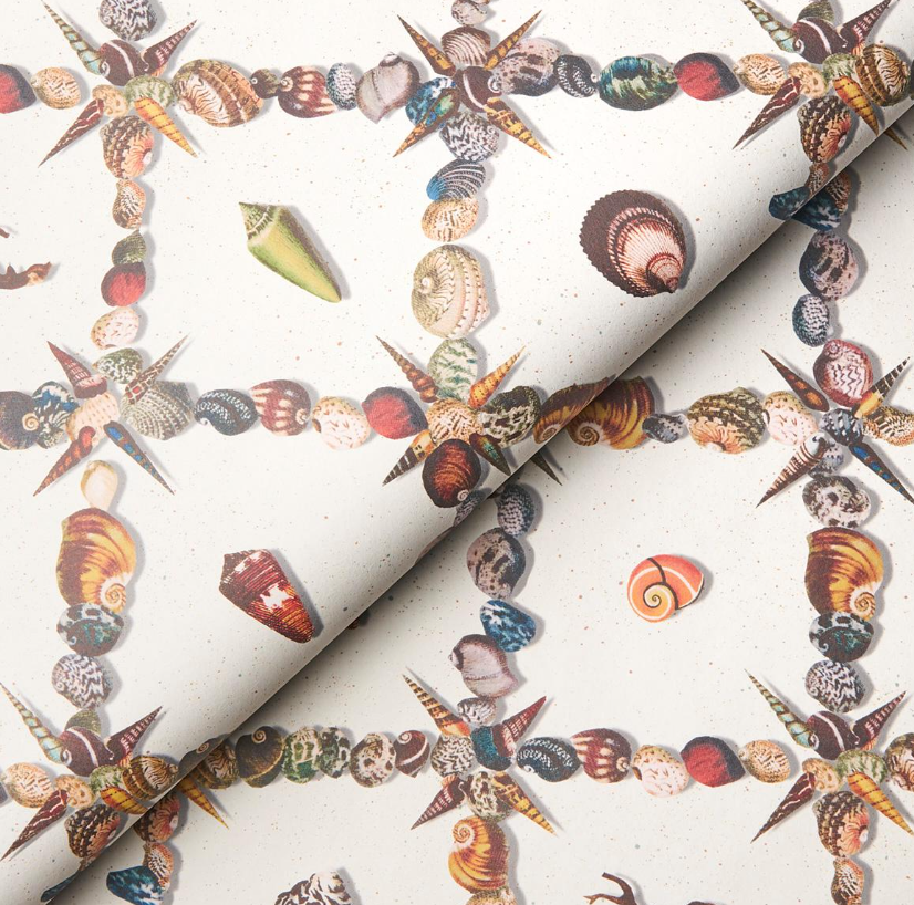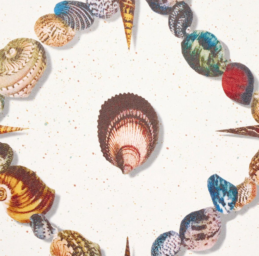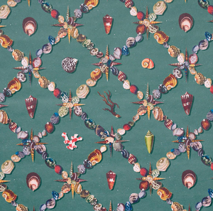 An artful collage of shells and marine curiosities, Grotto Treillage in multi-on-teal is a playful take on a traditional trellis.