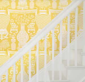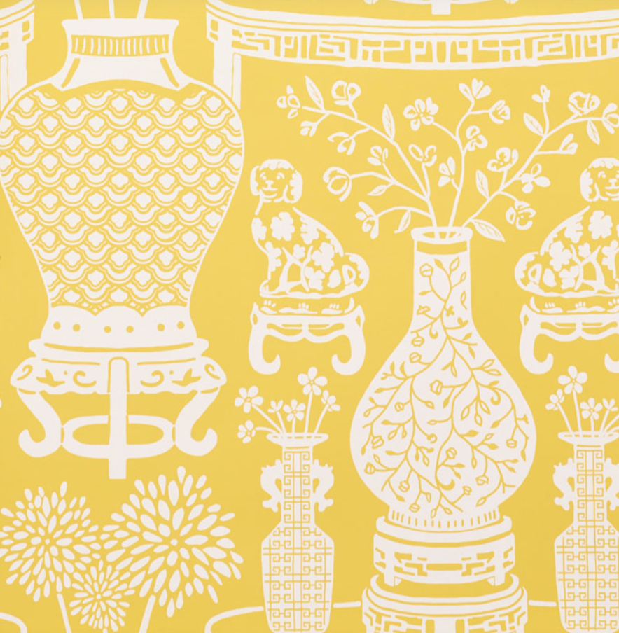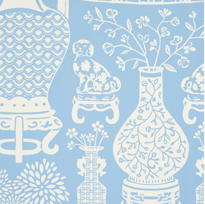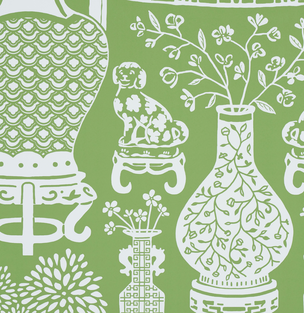 A preppy chinoiserie design features Ming vases and Staffordshire dogs in a pattern-on-pattern extravaganza with a mirrored repeat. Also available as a fabric.