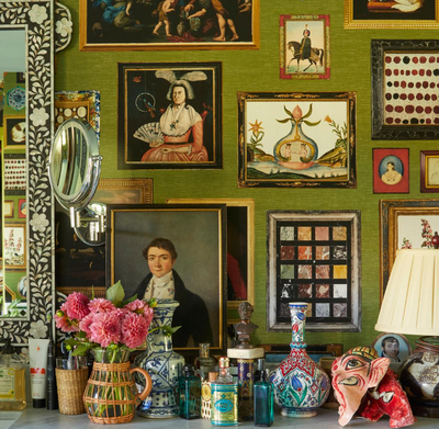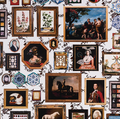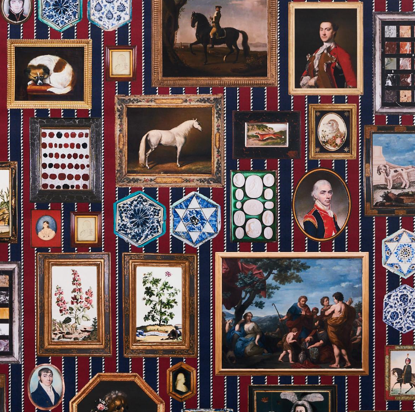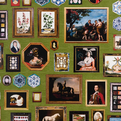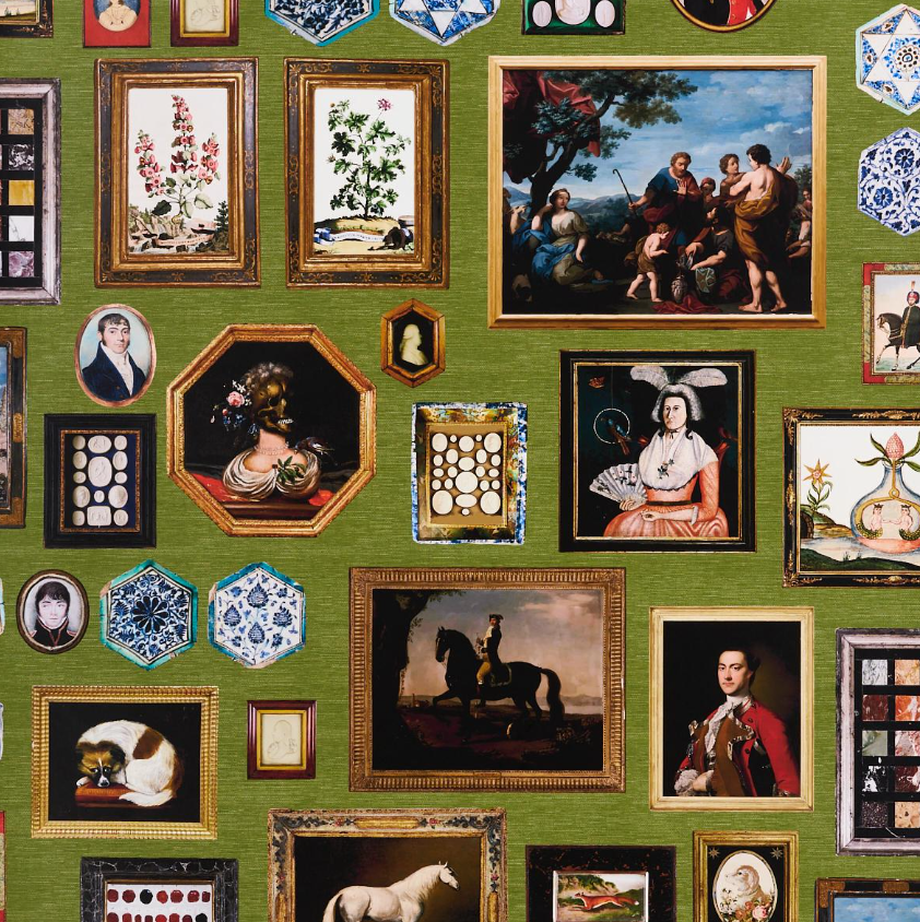 Inspired by an eclectic mix of antique paintings and collectibles, Le Grand Tour  is an extra-large-scale wallpaper design. This trompe l’oeil design is a wonderfully imaginative conversation starter, and each color way has a completely different background. Use it along a hall or up a stairway for a charming gallery effect.