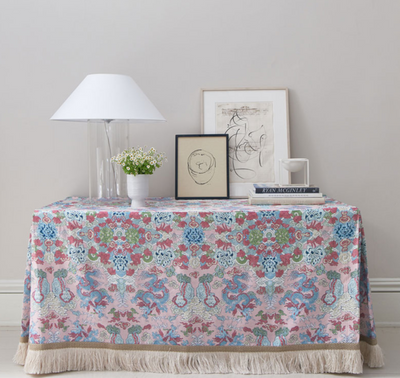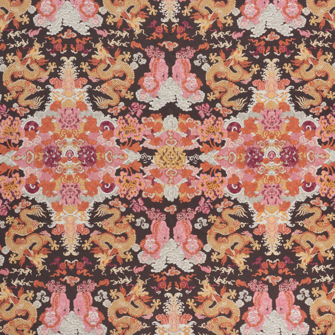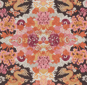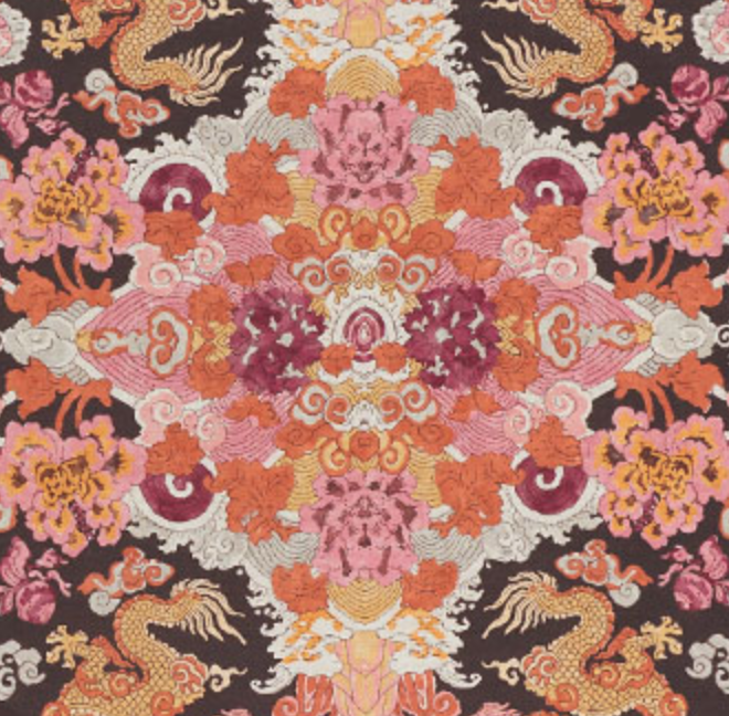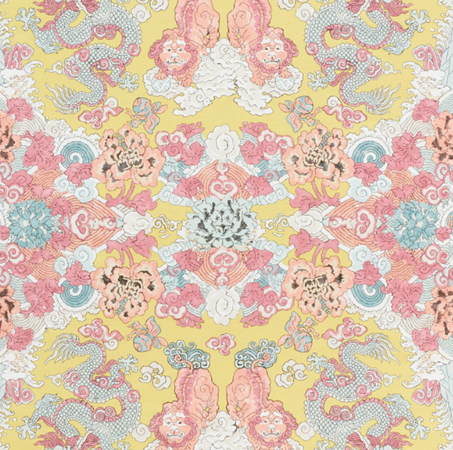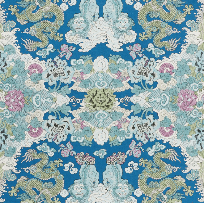 Foo dogs and fire-breathing dragons animate this fantastic, symmetrical print on a linen ground. It's an adventurous and exotic pattern that makes a memorable statement.