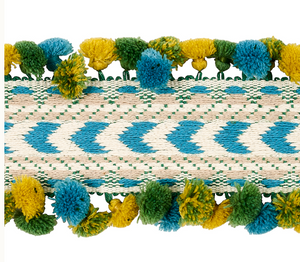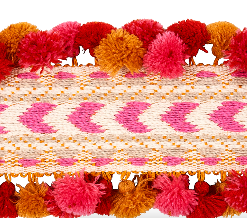 Inspired by traditional Peruvian textiles, Maracana Pom is a dimensional woven trim with playful, multi-colored pompoms. Stylish and textural, it's a striking finishing touch.