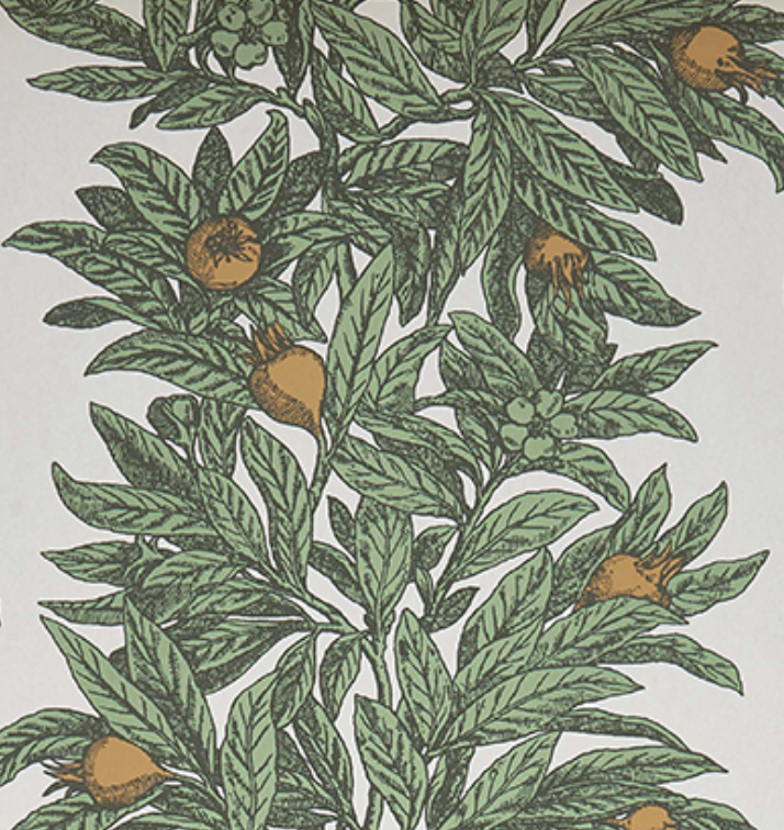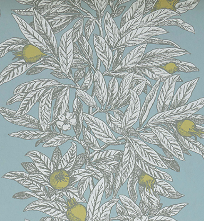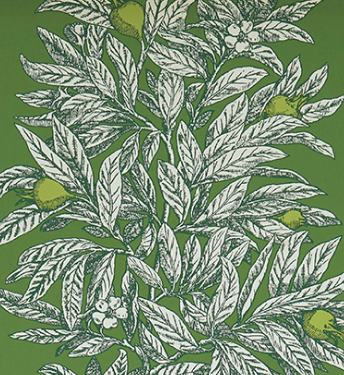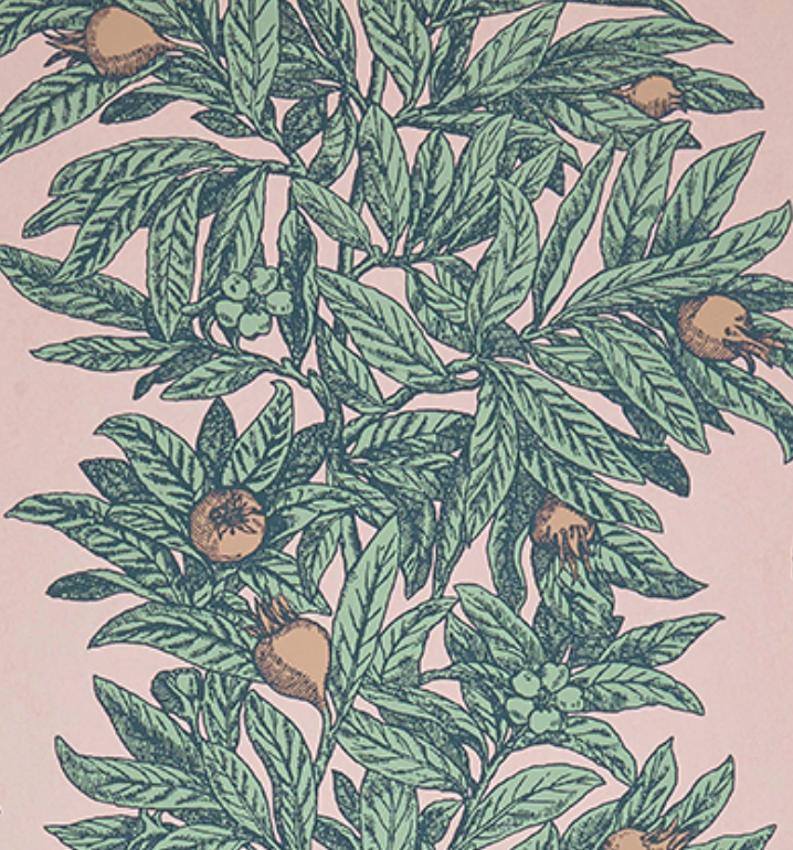 The leaves of an ornamental medlar tree bearing pretty blossoms and fruits, presented in a vertical stripe layout.