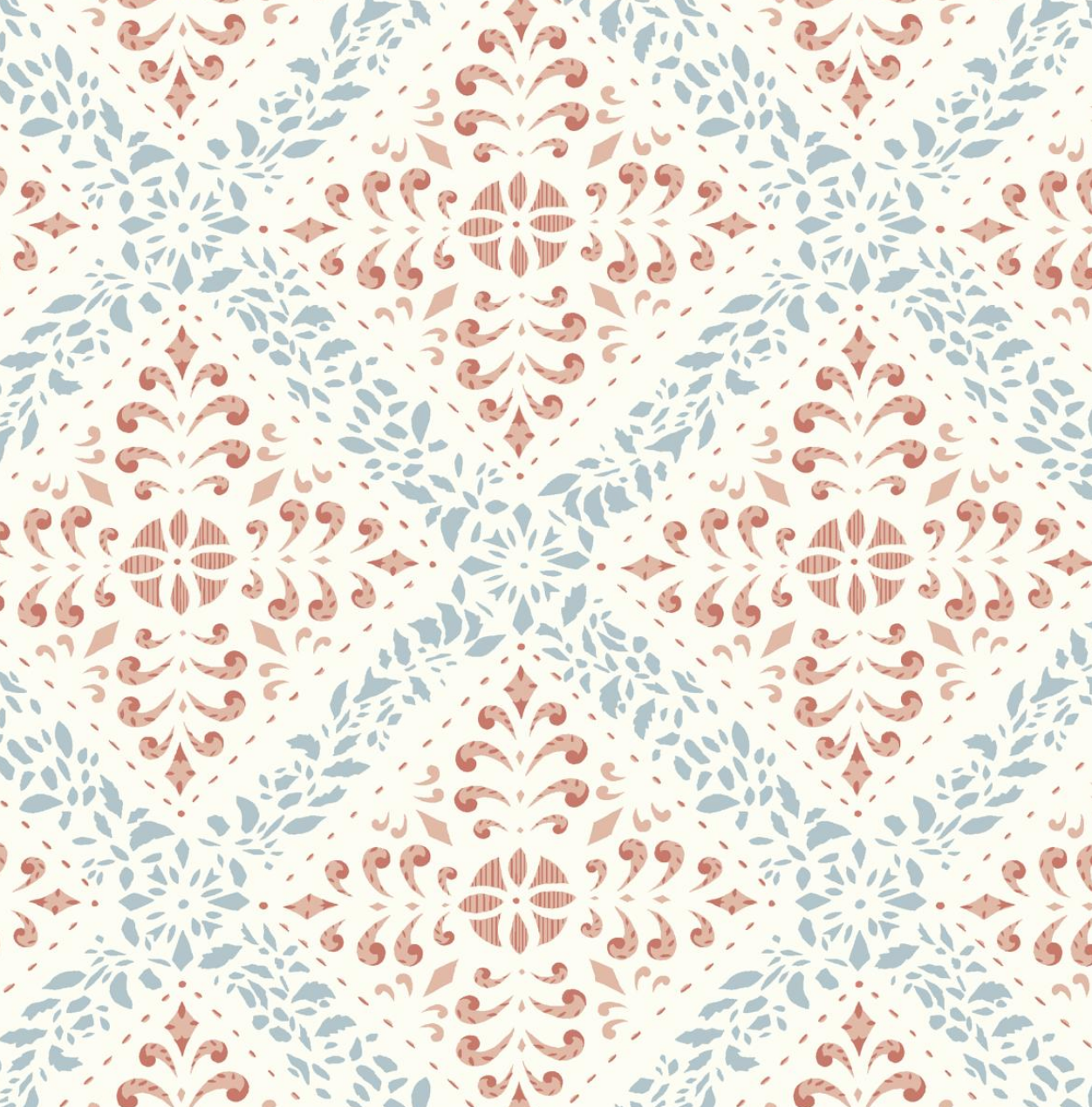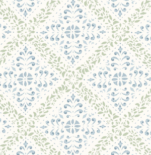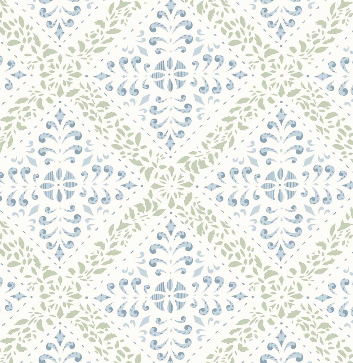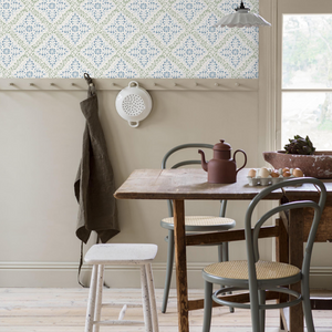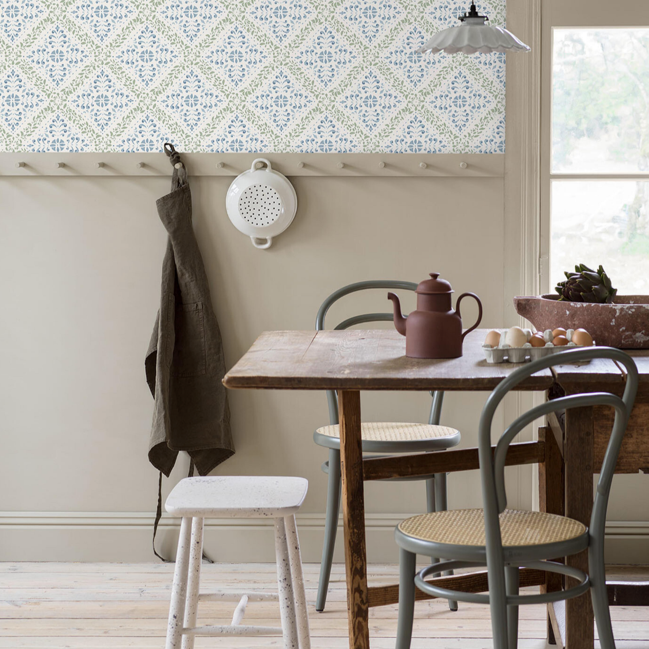 Nyborg in blue-and-green is a charming trellis-motif wallpaper with simplistic flourishes and pleasing leaf shapes reminiscent of an antique stencil. From Swedish heritage brand Boråstapeter.