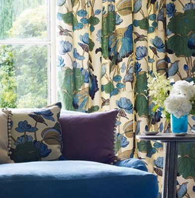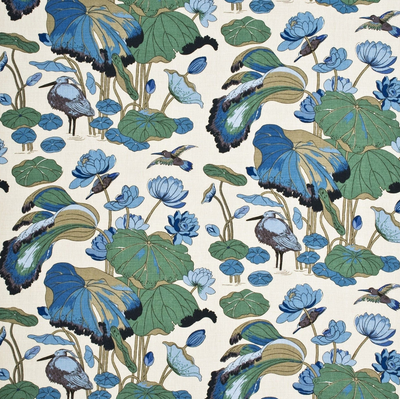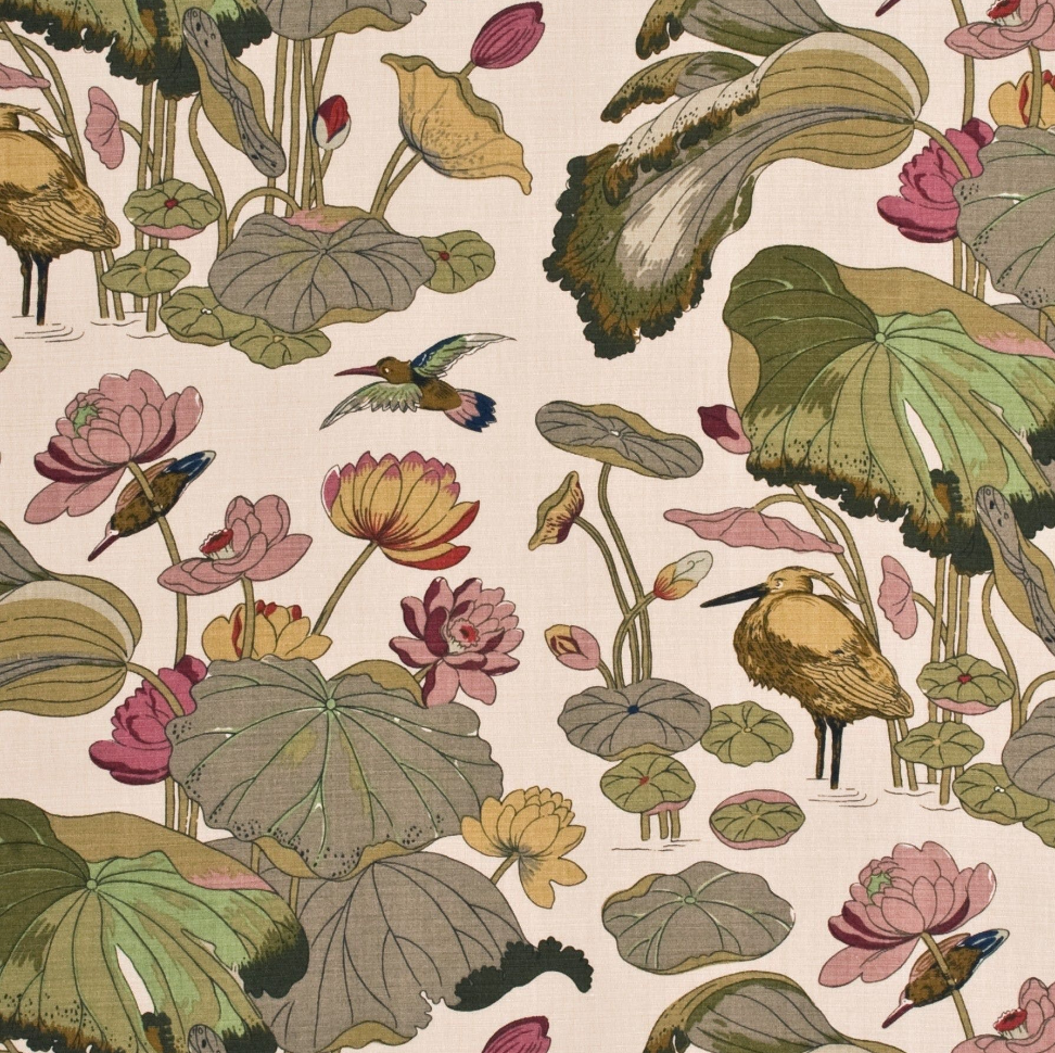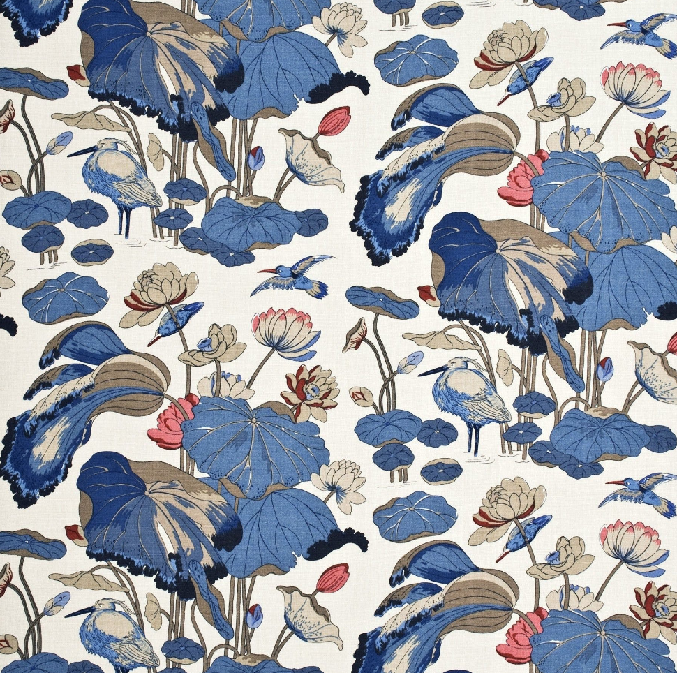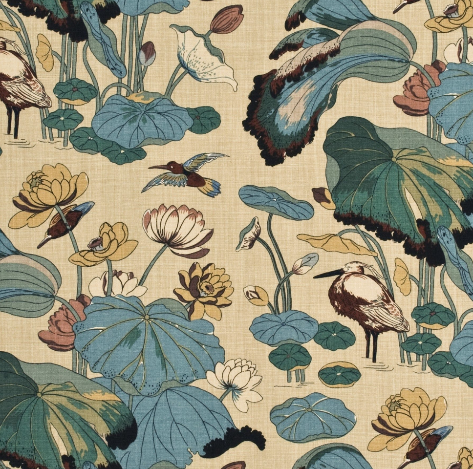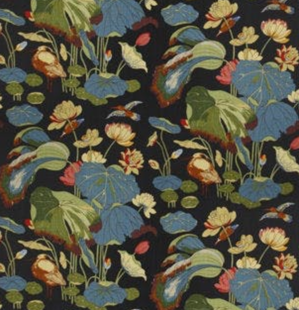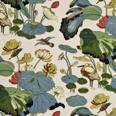A Ming dynasty (15th – 16th century) painting on a silk panel in the British Museum was Turner's inspiration for the Nympheus design featuring drooping lotus leaves with statue-us egret birds.