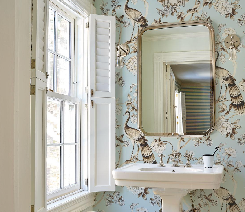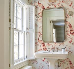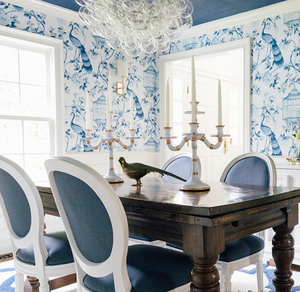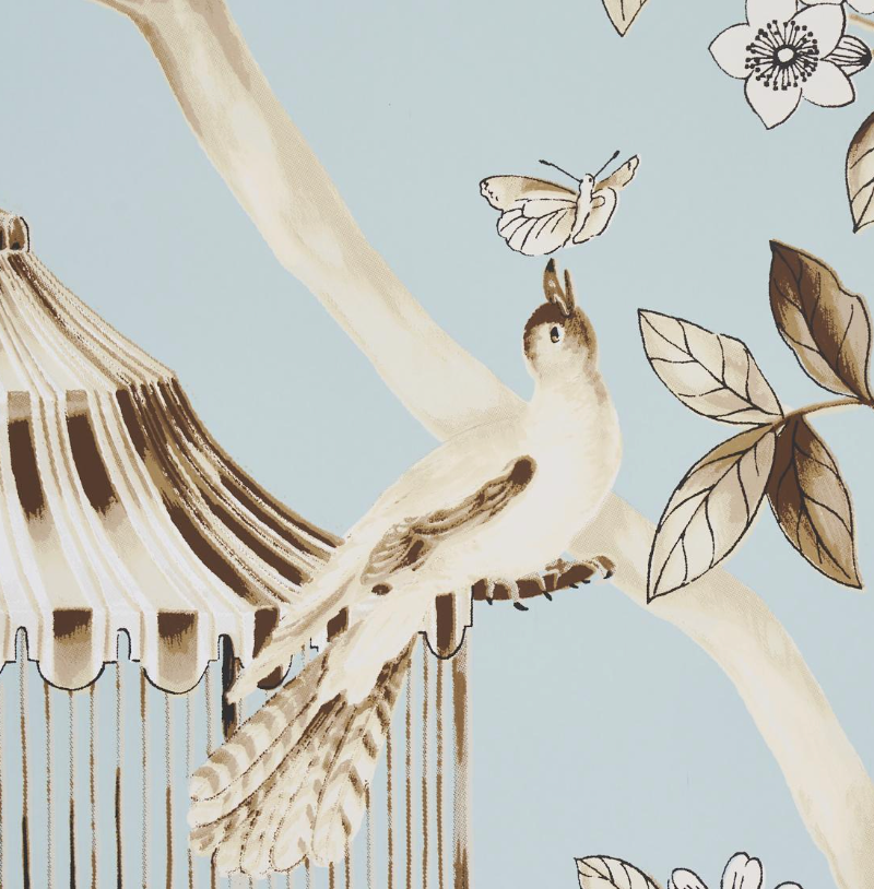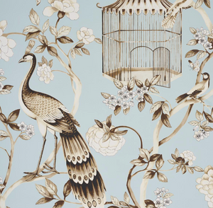 Beautiful chinoiserie print with peacocks, birds and cages.