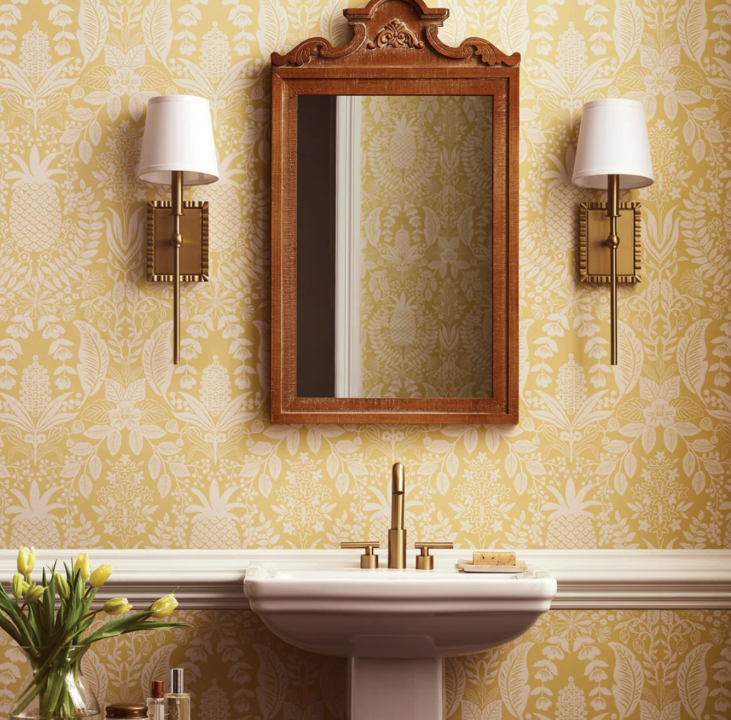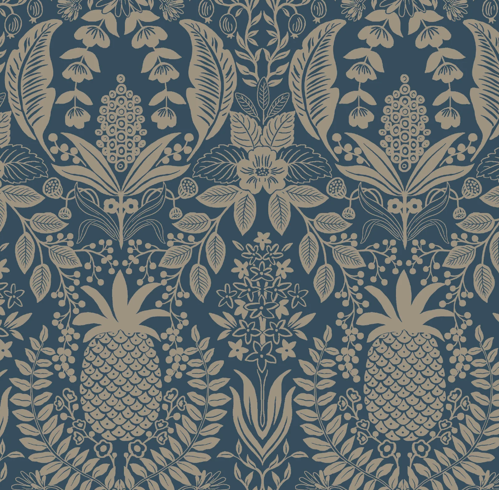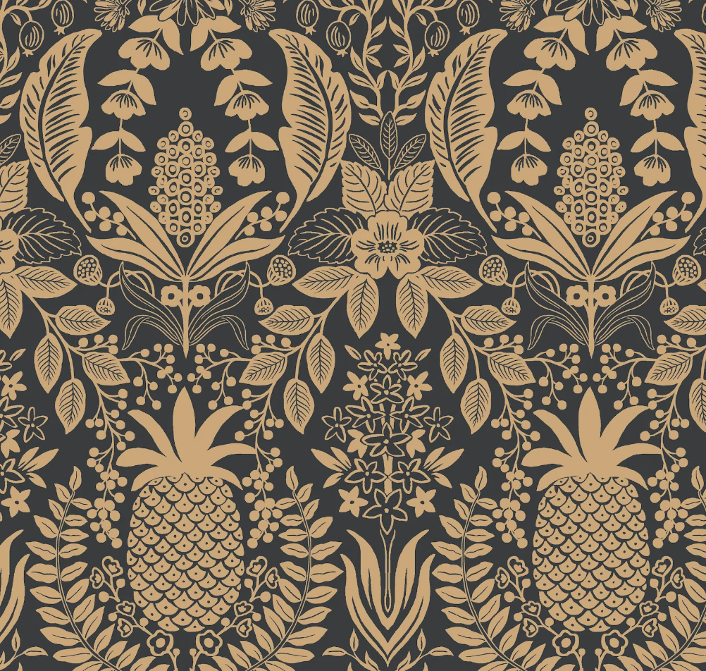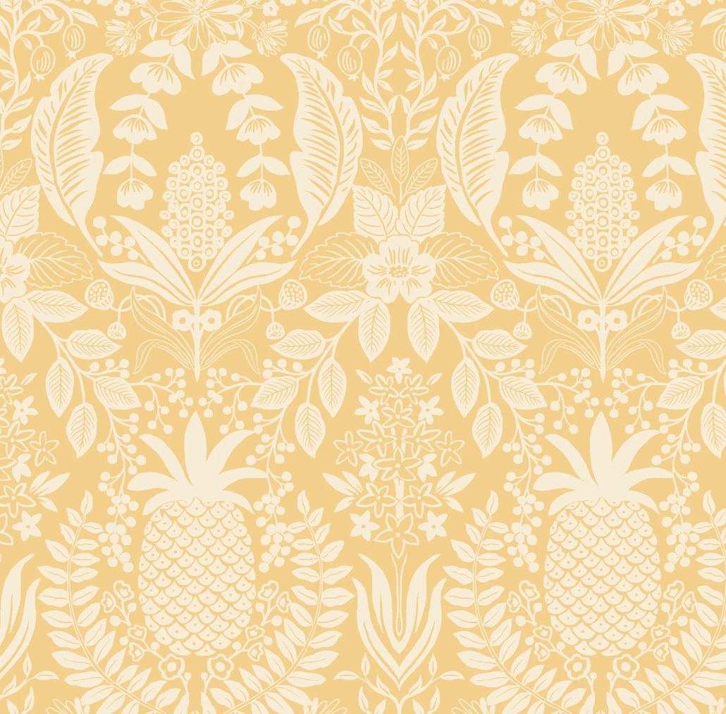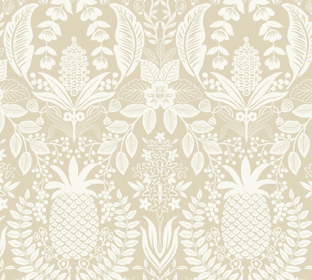 Pineapple Damask wallpaper features symmetrical trellises and pineapples, a traditional symbol of hospitality.