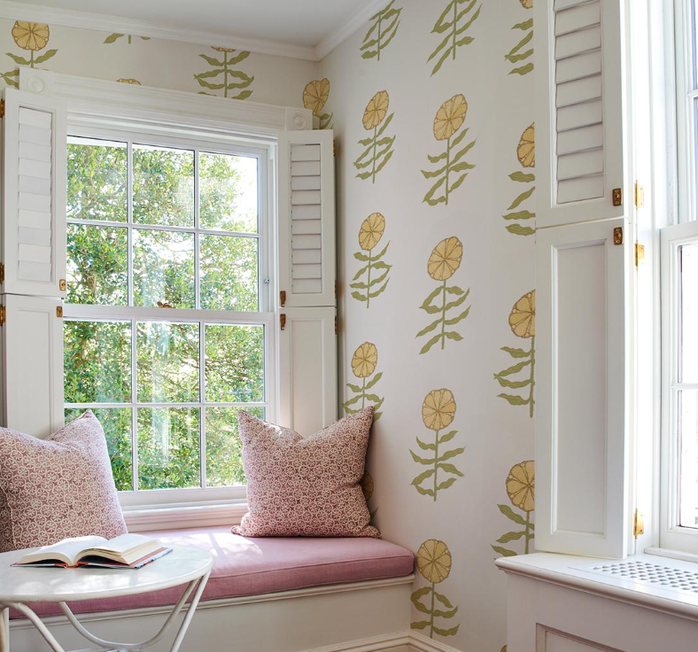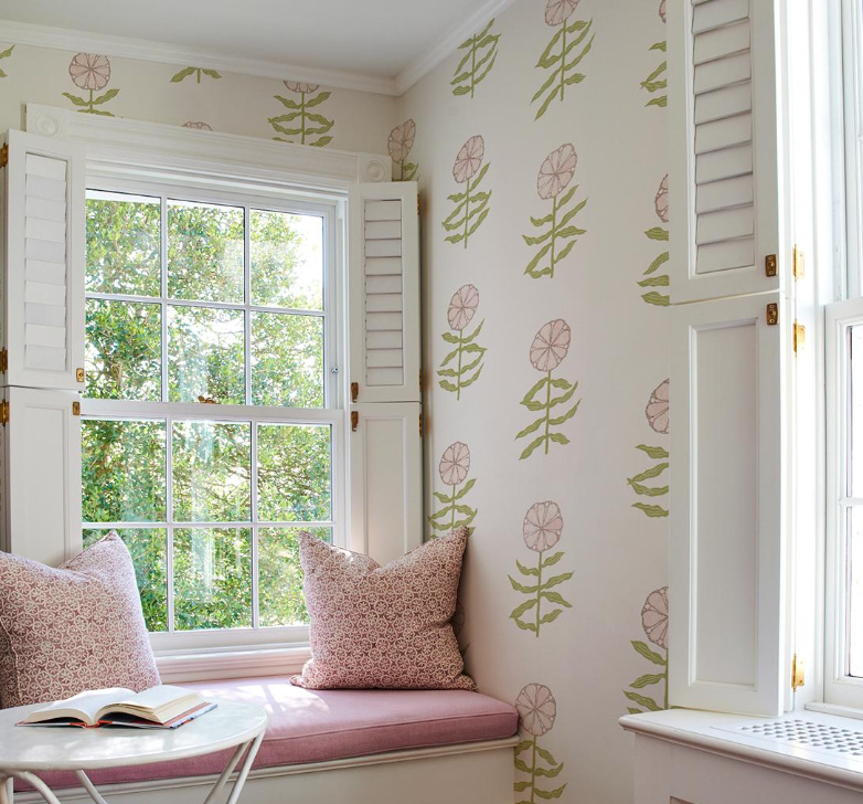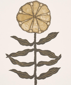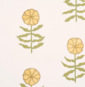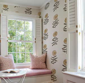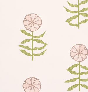 Pretty Petals features simple, stylized flowers that evoke traditional Central Asian textile motifs. This open, airy, large-scale wallpaper design from Schumacher was carefully printed to retain the subtle tonalities and unique character of the original sketches.