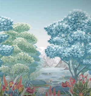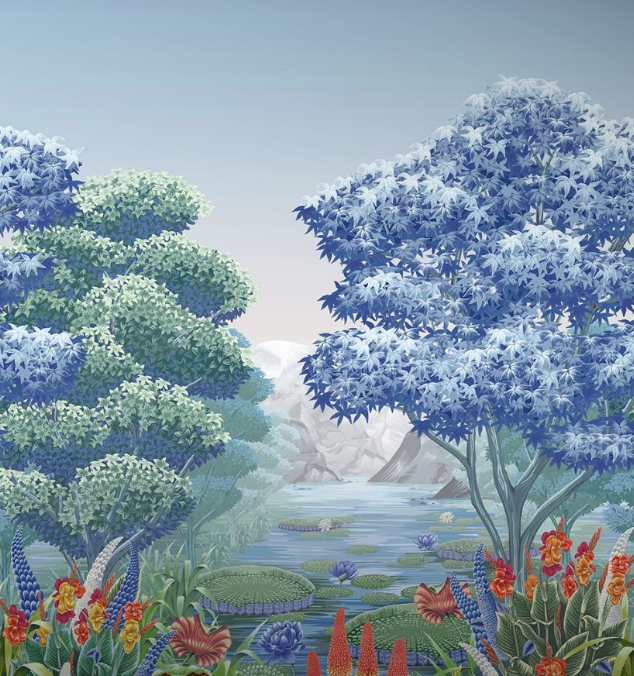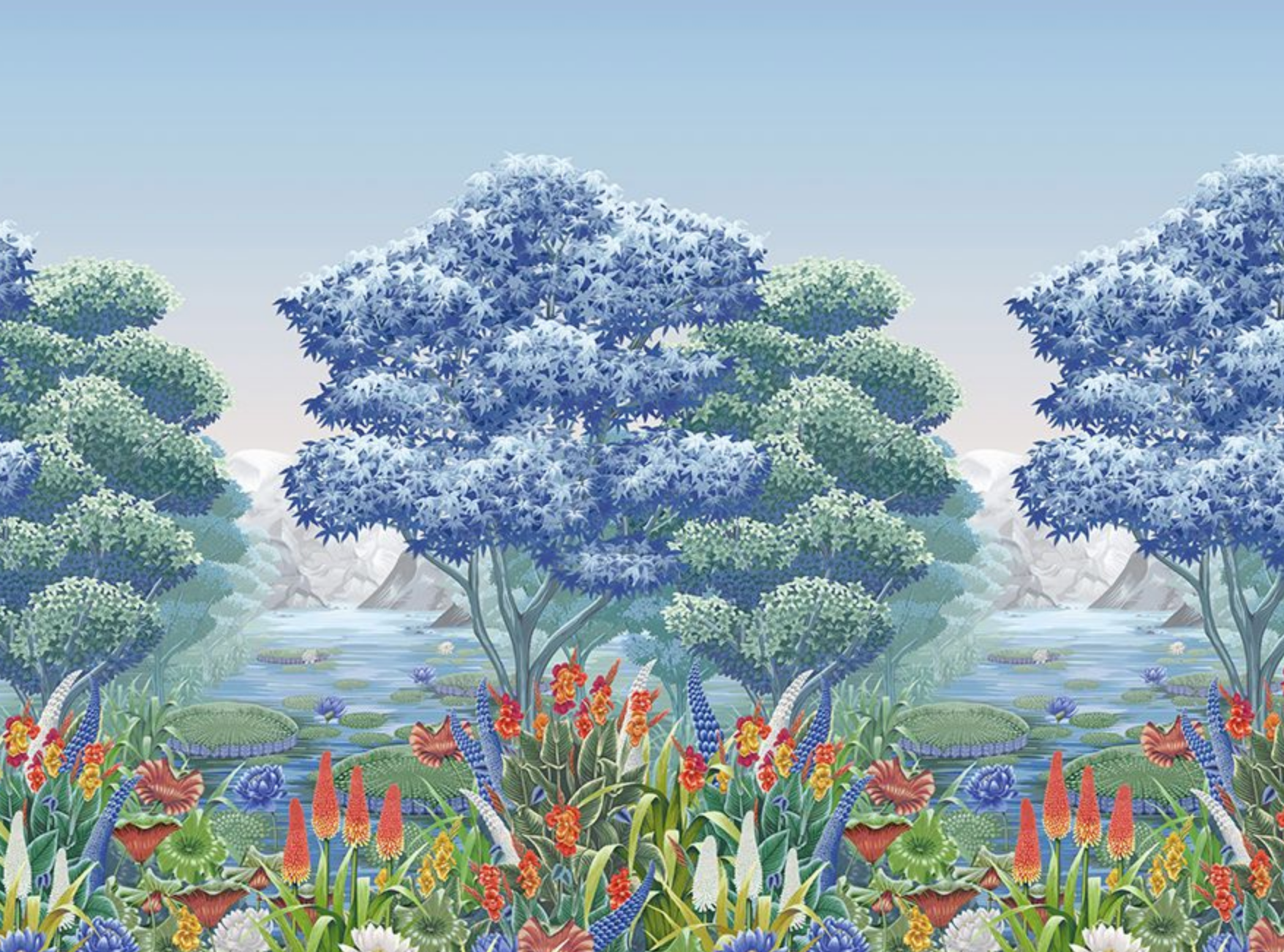 A beautiful vista of a lake with mountains in the distance and colourful aquatic plants in the foreground is viewed between two trees painted in a stylistic manner.