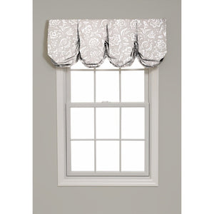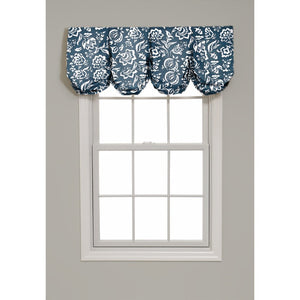 2x Fullness. Generally 2 poufs per 24". Print patterns centered on poufs. Non functional. Pulled up with rings. Finished length 18". 3 1/2  projection.  Valances are lined with white lining fabric, and board mounted. L brackets are supplied for installation