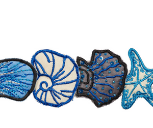 Hand-quilted and beaded seashells and starfish give evocative dimension to a beachy-chic accessory perfect for one-of-a-kind borders and flourishes that are whimsical and sophisticated.