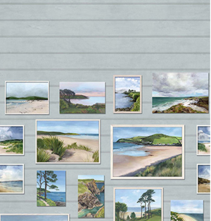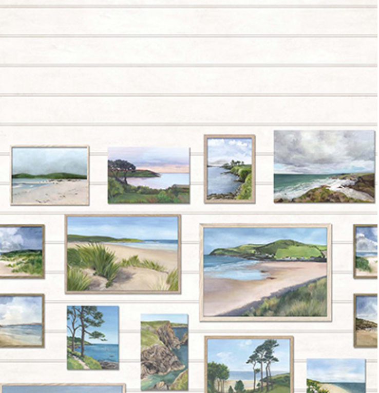 Watercolor seascape paintings are displayed on a faux painted wood paneled wall.