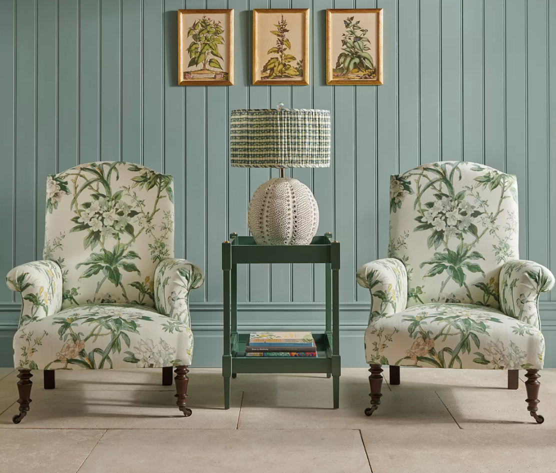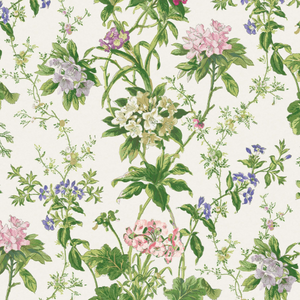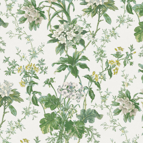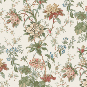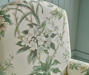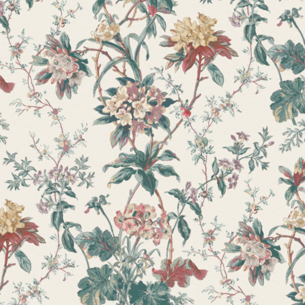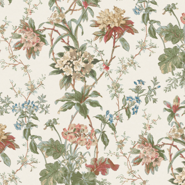 A large-scale trailing floral has been recreated from an archive block-printed chintz fabric, This amazing fabric showcases rhododendron and azalea sprays while preserving the charm of the original document.