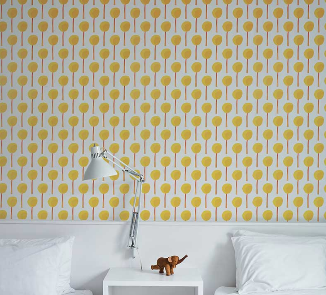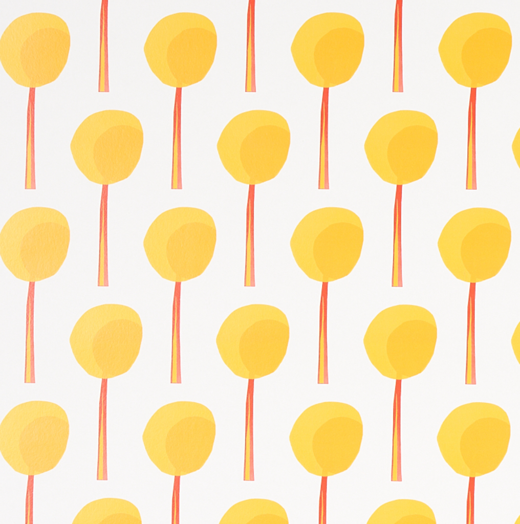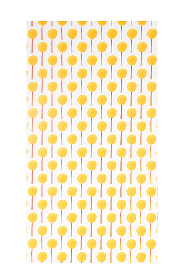 Topiary wallpaper in marigold is a small-scale, graphic pattern that features a procession of collage-like botanical forms.