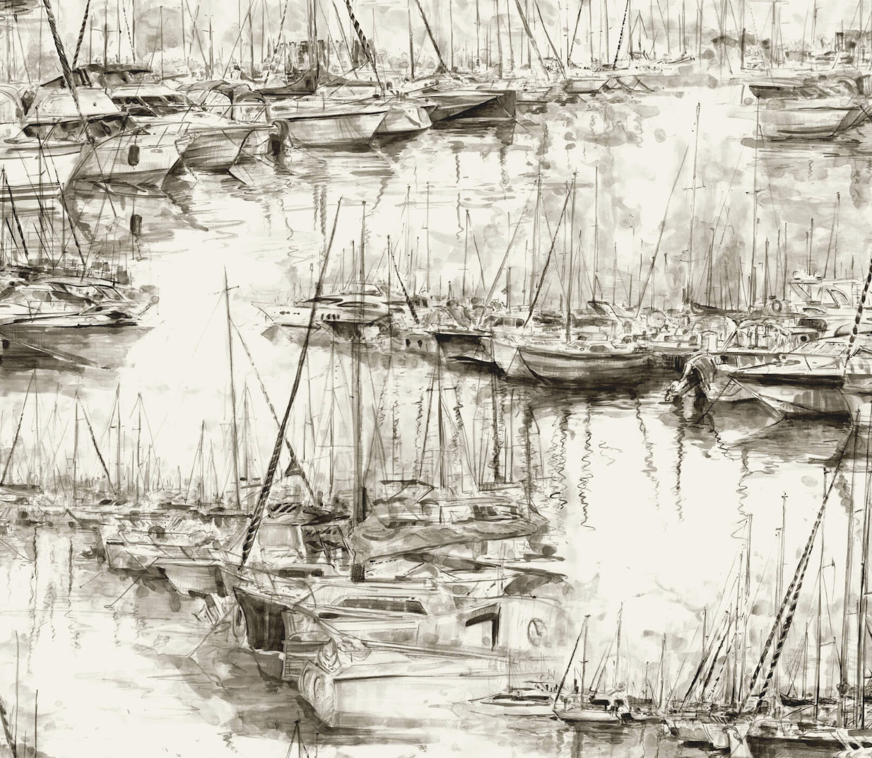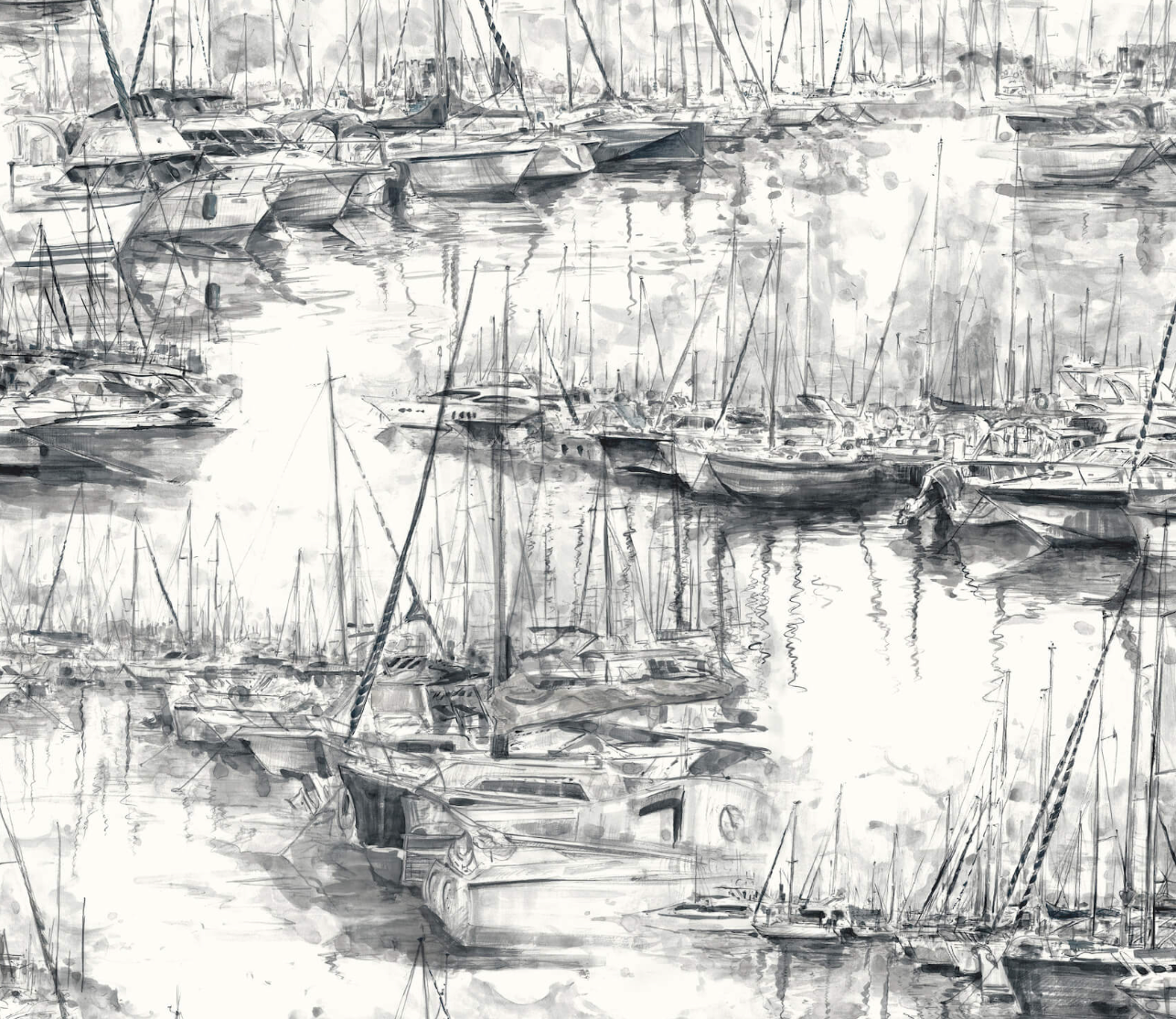 Rows of docked boats stretch as far as the eye can see in pattern Yacht Club's illustrative rendition. Featured here in shades of grey accented by subtle hints of teal.