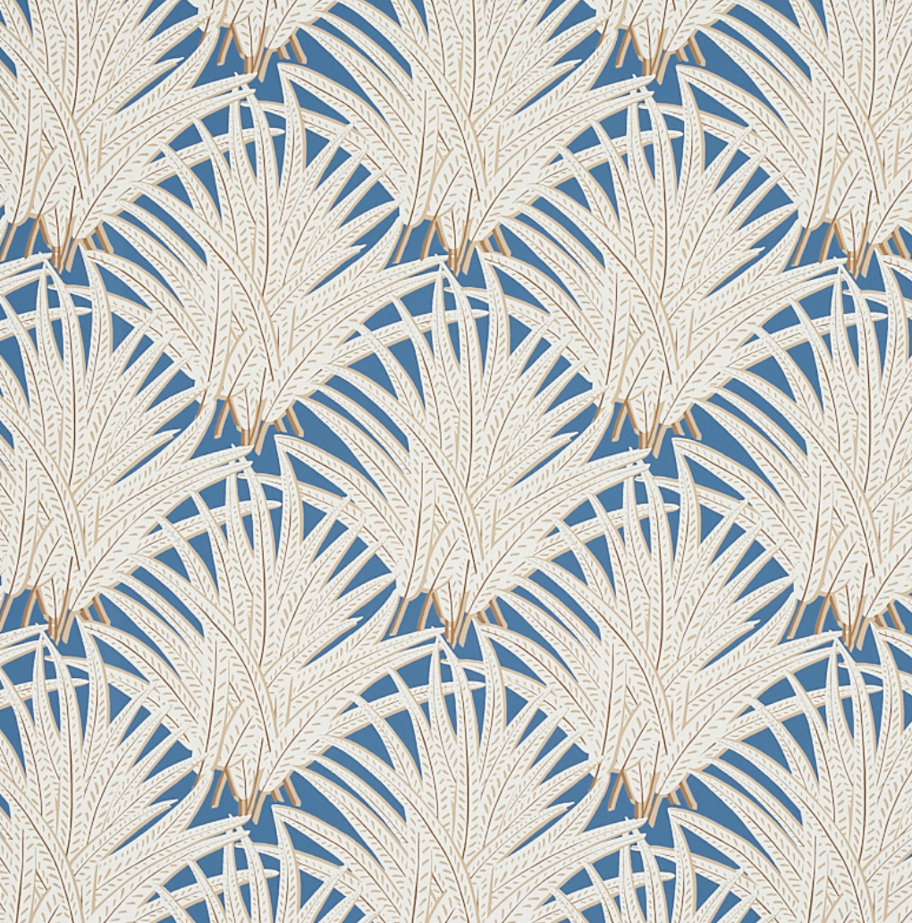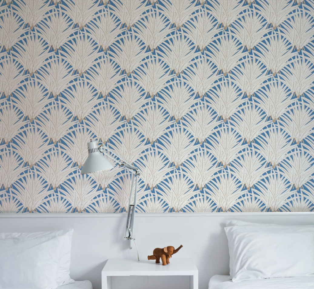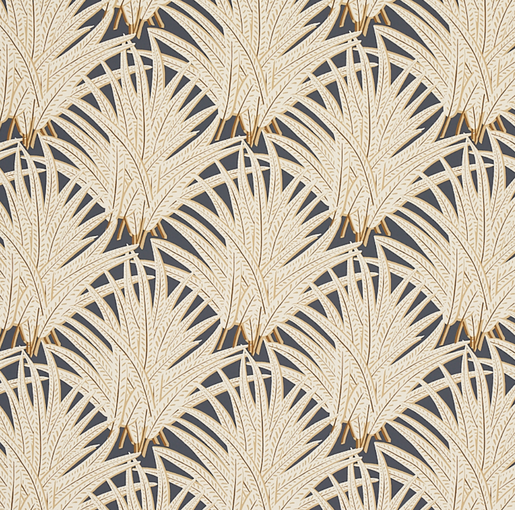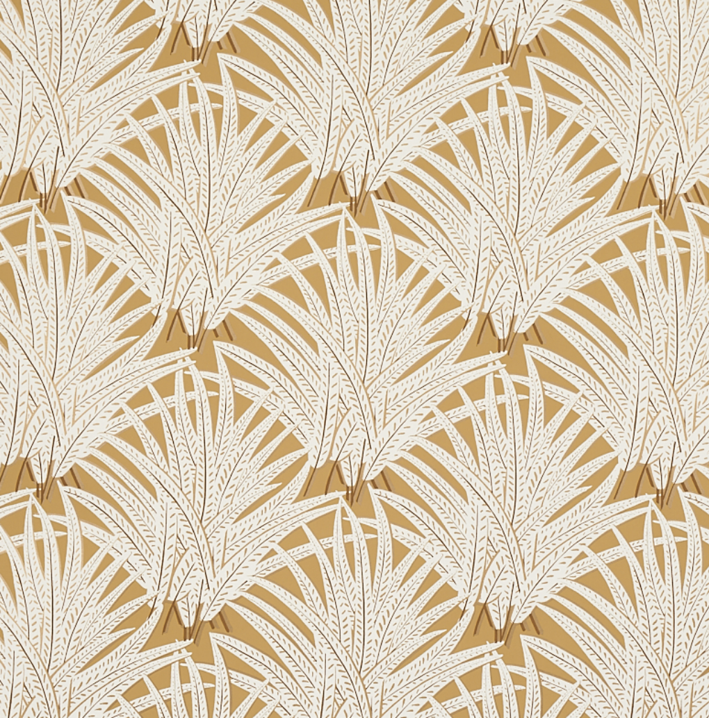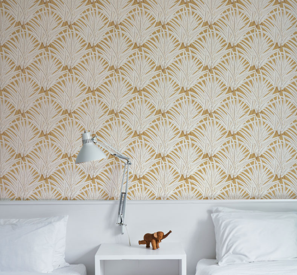 The feathery and stylized fronds in gold Zenada wallpaper create a chic and lively backdrop.